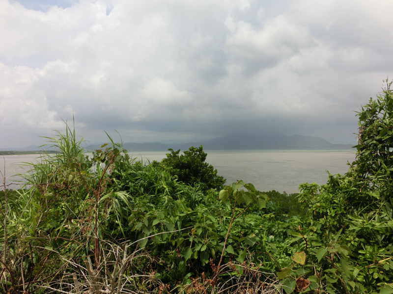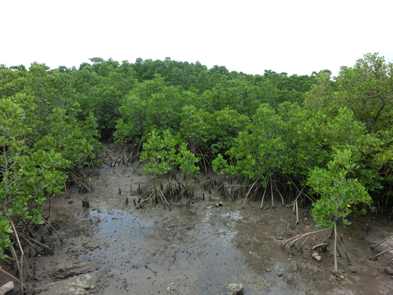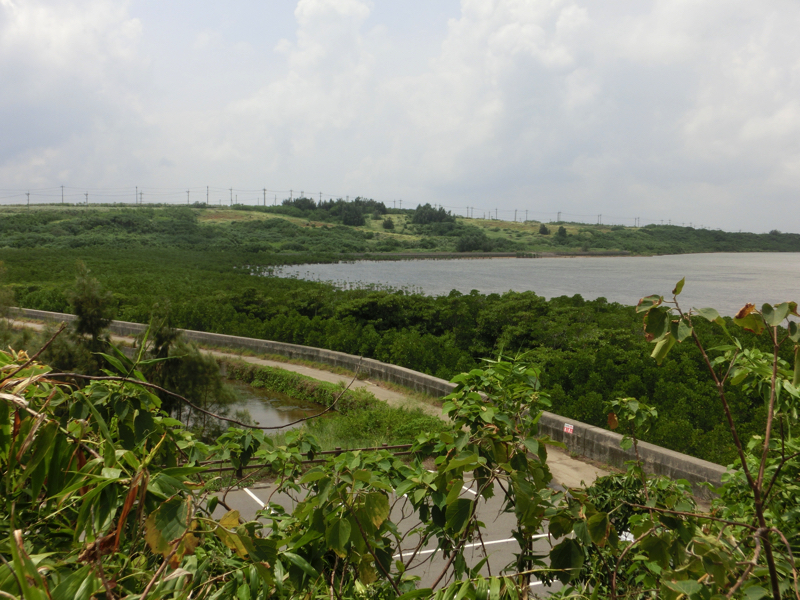 だいぶ下りてきたので、サイクリングコースに戻るには上り坂。これは電動じゃないと無理だろうな。コースに戻ると、ここからしばらくは平坦な道。サトウキビ畑を横にし、その向こうの海を感じながらどんどん進む。若干の上り坂はあるが快調に入ると、海側の展望台への案内看板が。坂道をずっと降りると駐車場があり、海沿いにあるのが展望台。ここは数メートル程度で登れるので楽だ。対岸には西表島が見えている。かなり雲がかかっているように見えるので、ひょっとしたら雨かもね。すぐ目の前には、マングローブが群生している。展望台を下りて近づいていくと、よく見るとたくさんのシオマネキがいました。去年の西表島が懐かしい・・・