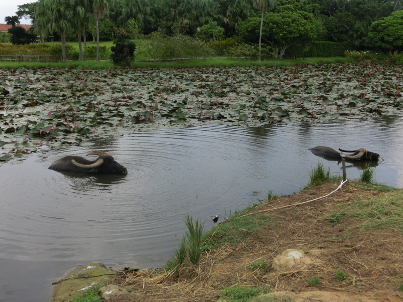 はいむるぶしに到着。敷地内はゆったりと広く、自転車でそのままフロント棟まで進む。まずは中に入ろう。冷房の効いた室内はゆったりとしたソファーが並び、やっぱりリゾートはいいな。ほてった体を冷やしましょう。落ち着いたところで、中のお土産やさんを見たりしながらゆったり過ごす。かつてここに泊まる計画を立てたことがあったが、あの時は台風直撃によりフライトがキャンセルとなったわけで、その代わりがグアムへのマイレージツアー。懐かしい。はいむるぶしの敷地を歩いてみると、たくさんの動物がいる。ヤギやアヒルもおもしろいが、なにより池に水牛がいたのはびっくり。ゆったりとした時間が流れる、そんなはいむるぶしでした。