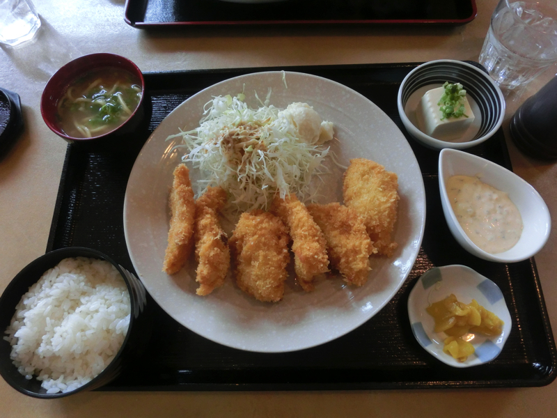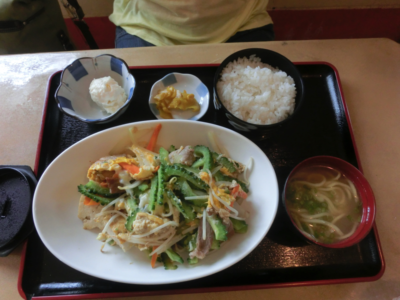 港前のレンタル屋さんのすぐ横に、お食事処を発見。お腹が減ったし入りましょう。定食やどんぶりなどがいろいろあるが、魚フライの定食とゴーヤチャンプル定食をいただきましょう。魚フライは柔らかい白身魚で、さっくりしたころもにソースがいい感じだ。ゴーヤチャンプルは安定のおいしさ、やっぱり基本は最強です。沖縄らしい定食がいただけて大満足、ごちそうさまでした。