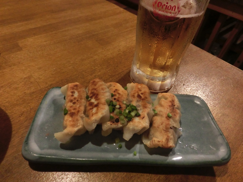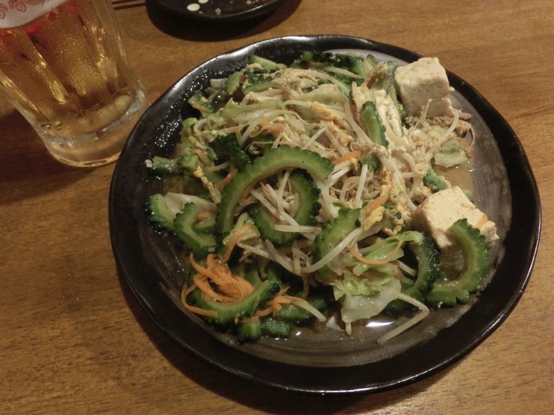 目がさめると、外は大雨。昼間に降らなくて本当によかったな。今日の夜ごはんはどうしようか。昼がちょっと遅かったせいか、そこまで空腹でもないし外はかなりの雨なので、ホテル併設の居酒屋さんにしましょうか。昨日の昼に続き2回目の利用、ホテル宿泊者はドリンクが半額とのことなのでそれもラッキーだしね。さて、ではオリオンビールで乾杯だ。まずは定番のもずくでさっぱり、そして島マグロの刺身。もっちりした食感で、旨味の強いマグロがビールとよく合う。続いてはラフテー、しっかり味がしみていて脂身がねっとりといい食感です。やっぱりおいしいなあ。次は餃子、島豚だそうで。餃子はどこで食べても間違いないです。つまみ系が続いたが、もう少し食べたいしビールもお代わりしたいし野菜も欲しいので、ここはやっぱりゴーヤチャンプル。もやしに島どうふで食べ応えもあるし、もはや締め代わりとして楽しめます。ごちそうさまでした。