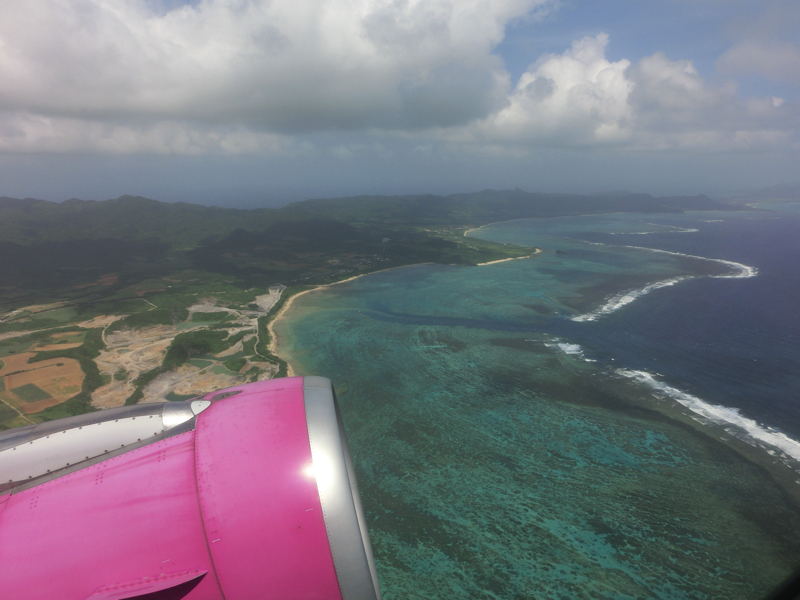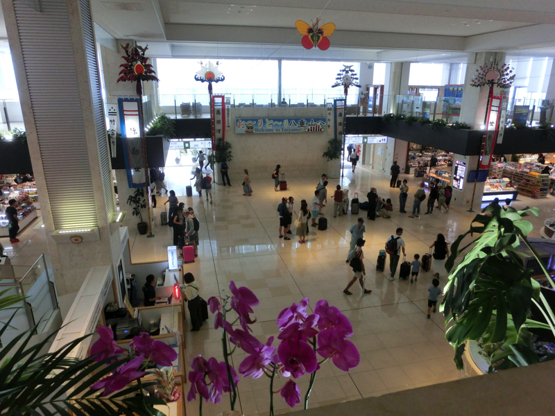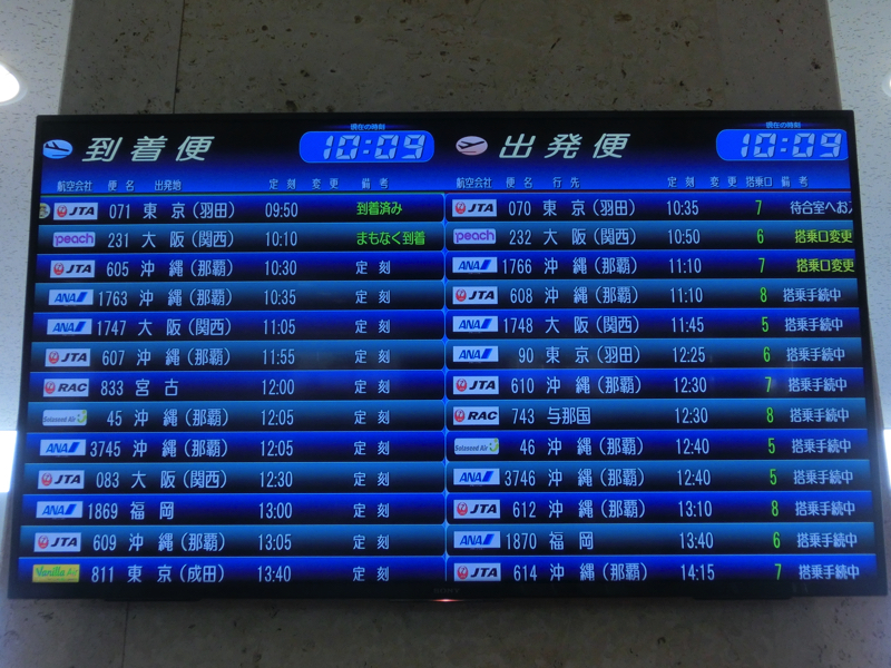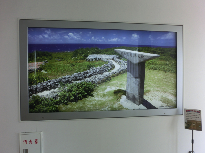 空港行きのバスはおよそ15分に一本あり、9時3分のに乗れました。これは来た時とは違い、ANAホテルなどは寄らない路線。空港には9時40分頃到着、Peachのチェックインにはちょうどいい時間です。チェックインで身軽になり、お土産やさんをみる。おやつ用のサーターアンダギーをゲット。出発ゲートへ向かうと、途中に波照間島の最南端碑の写真がありました。そういえば去年これを見て、リベンジを誓ったわけで、無事達成だ。