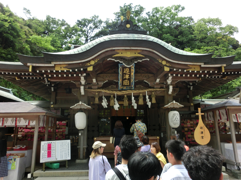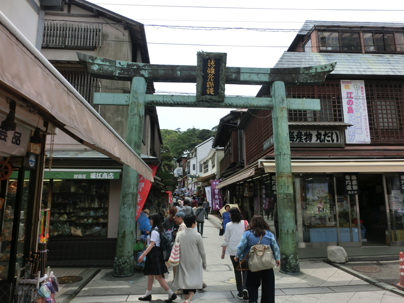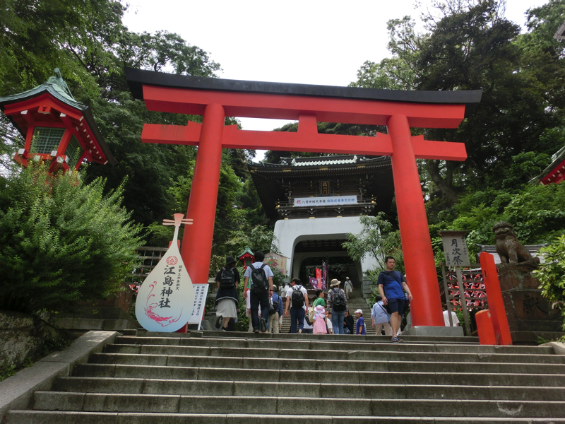 橋から続く道を進むと、ここは江島神社の参道。ここも左右にいろんなお店があって賑やかだ。ではまず江島神社へと行きますか。ここは辺津宮・中津宮・奥津宮からなる神社で、海の女神を祀っているとのこと。三人姉妹の女神様とあれば、すべてお参りするしかないな。階段を登っていくと最初にあるのが辺津宮(下之宮)、ここには日本三大弁財天の一つである妙音弁財天が奉安されているとのことで、ここは金運と芸事をお願いしましょう。