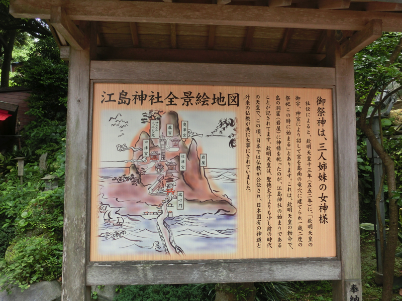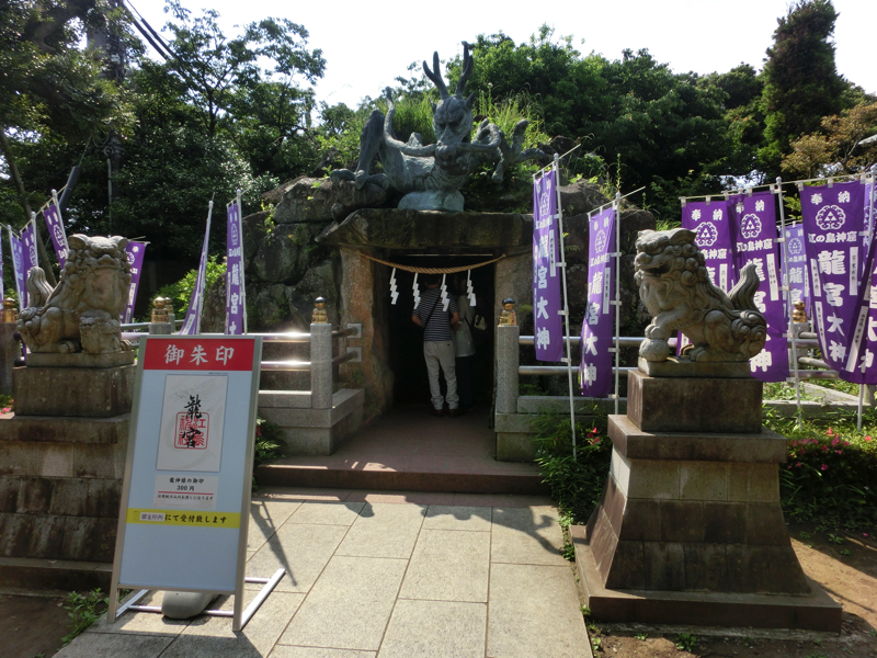 再び階段を登っていくと、三姉妹の最後、奥津宮(本宮)に到着。長女だそうで。天井には八方睨みの亀が描かれていて、どこからみても目があうとのこと。その隣には、龍神をまつる龍宮(わだつみ)大神があり、江ノ島は古来龍の住む処と言われていたらしい。龍を祀り、海の女神を祀りということで、この島全体が神聖な場所だったんだろうな。やっぱりモンサンミッシェルみたいなものか。