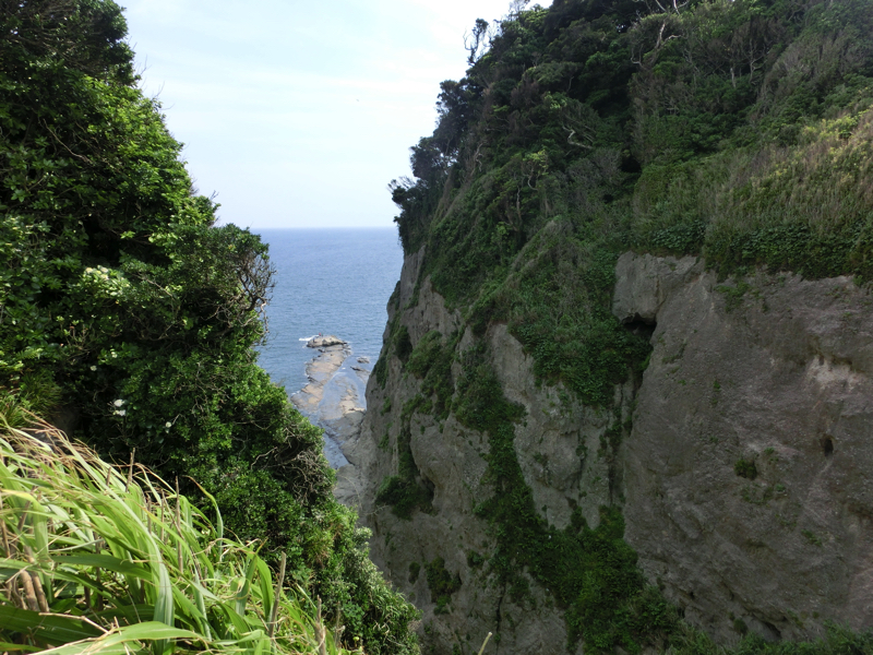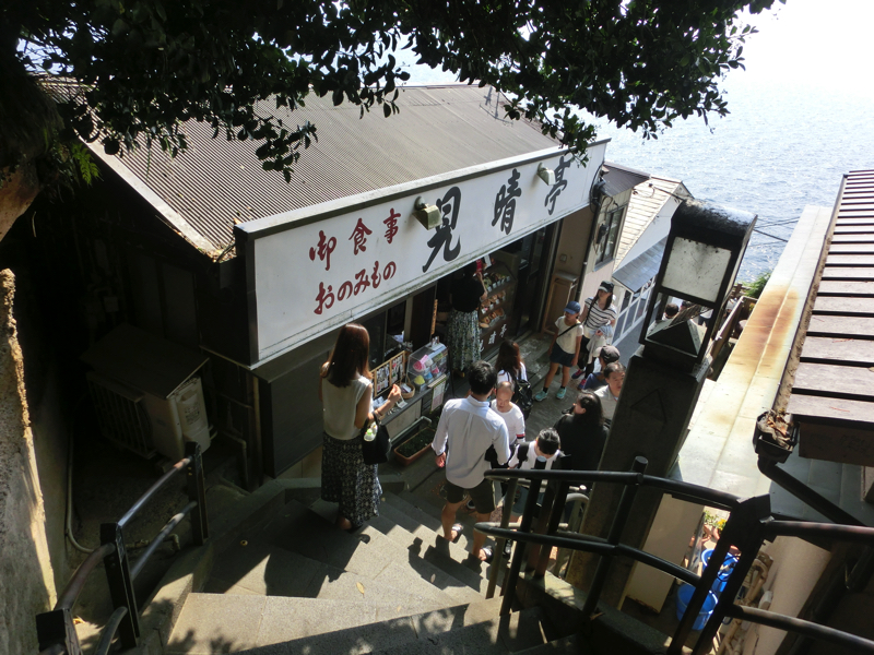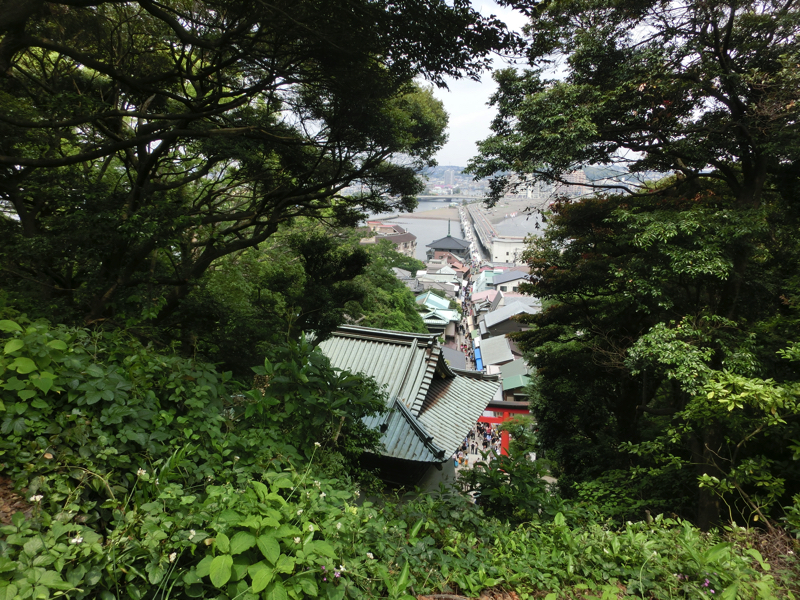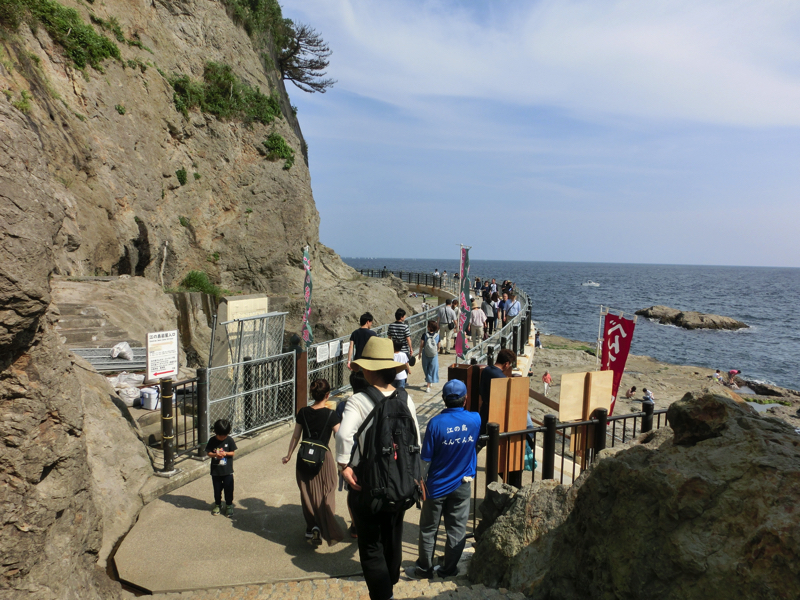 ここからはしばらく階段を降りていく。途中で断崖が見えるが、何羽かのトンビが行ったり来たり、そして追いかけ合ったりしている。ひたすら食べ物を狙っているんだろうなあ。油断は禁物です。このあたりの道沿いにもおみやげ屋さんや食事処、民宿などがある。江ノ島入り口あたりよりもゆったりした雰囲気なので、泊まるならこのあたりがいいかもね。