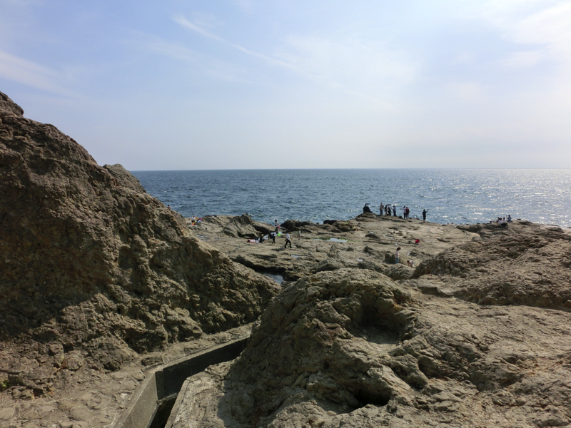 島の奥まで来たが、さらに進むと海へと降りる道がある。この先には岩屋があり、ここが江ノ島信仰発祥の地。海がキラキラしていて、この岩場とのコントラストが美しい。稚児ケ淵という岩場からは富士山まで見えることもあるとのこと。潮溜まりには小魚が見えているし、釣りをしている人もいるし、穏やかな海は気持ちがいい。