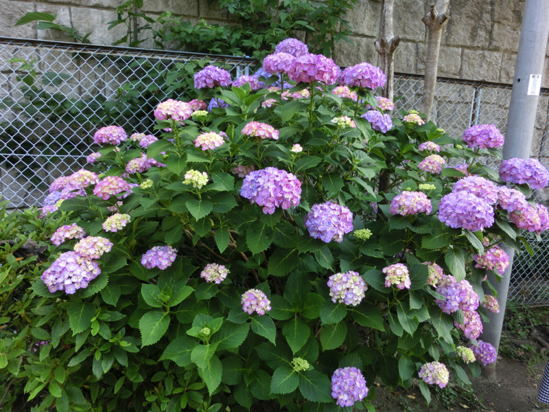 交差点の地下道から、東浜海水浴場へと上がる。ここからは穏やかな海が見渡せ、たくさんのヨットが出ている。この辺りは風が強いようで、色とりどりの帆が海を進む様子は圧巻だ。ここは来年の東京オリンピックではセーリングの会場となるようで、この砂浜がいろんな国の人たちで賑わうんだろうな。では行きますか。江ノ電に向う途中、紫陽花が満開になっている場所がありました。時期はちょっと早いが、こうして満開の場所もある。