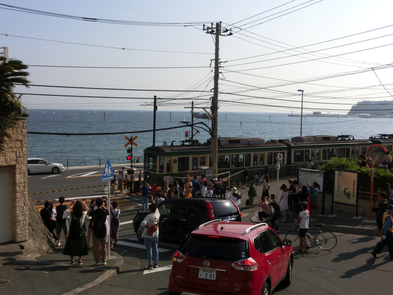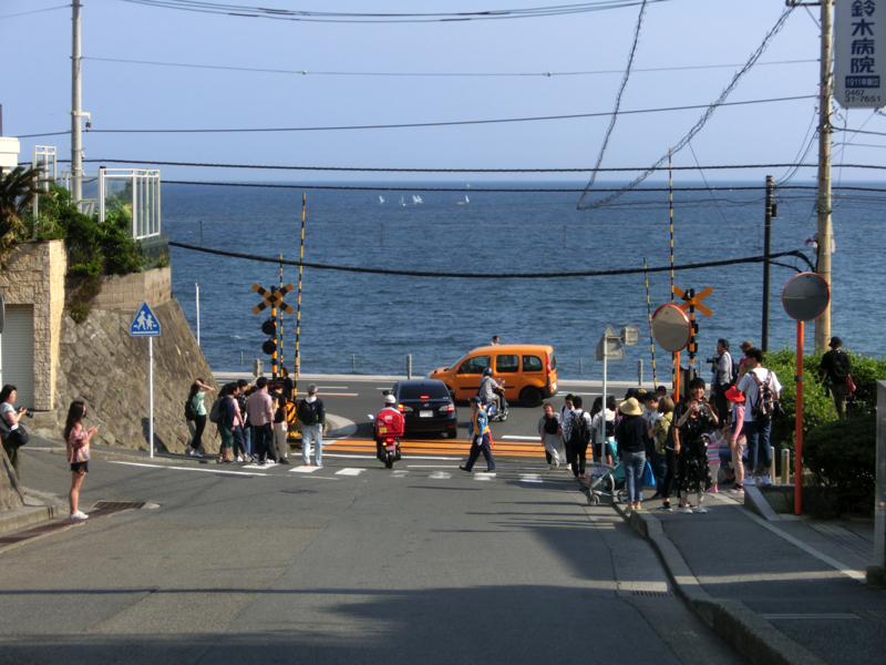 江ノ電は観光客で混雑している。外国人もアジア系を中心に、かなり多い。みんないろいろよく知っているよね。そんなアジア系にとっての目的が、鎌倉高校前の踏切。スラムダンクなどででてくる場所だが、アニメ好きの人たちにとっては一つの聖地。せっかくなので降りてみよう。踏切のまわりはかなりの人だかりで、電車が通るときはみんな写真を撮っている。そこそこ交通量も多いので、警備の方の軽やかな指示に従いつつ写真を撮りましょう。少し離れてからズームで撮るくらいの方が角度がでていい感じ。