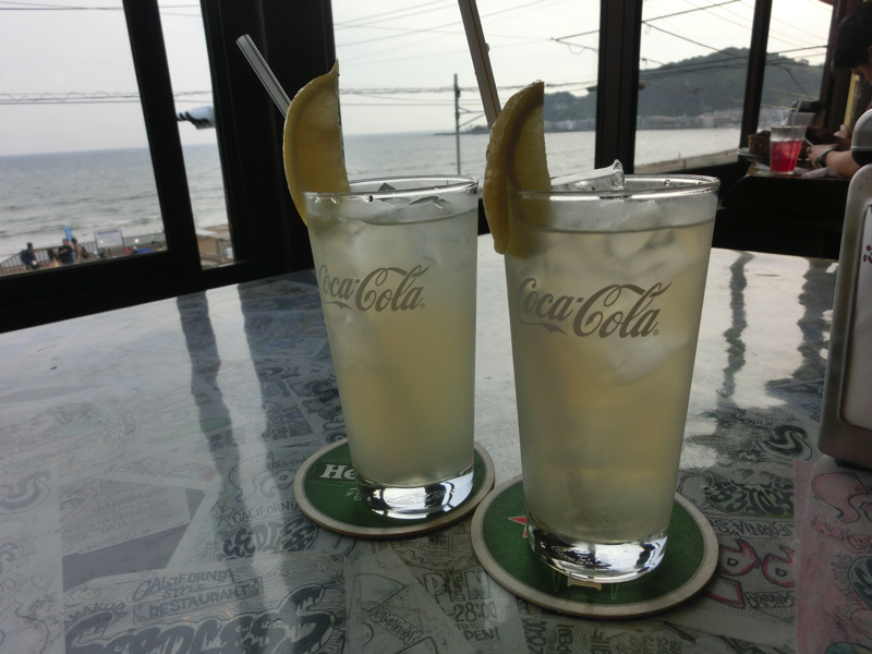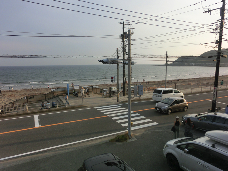再び江ノ電に乗り、由比ヶ浜駅で下車。駅前からは海は見えないが、住宅街を10分ほど歩くと由比ヶ浜に到着。今は海開き前なのでまだ泳いでいる人はなく、静かな雰囲気。でも海の家を建設中のようだし、今年も多くの人がここに来ていろんなことが起こるんでしょう。海に面したカフェに入り、レモネードでほっと一息。今日は江ノ島からずっと動いているので、ようやく休憩できたかな。欧米系のお客さんもぼちぼちいるようで、でも言葉だけではどこの国の人かわかりませんでした・・・夕日が沈みかけたころ、退散しますか。