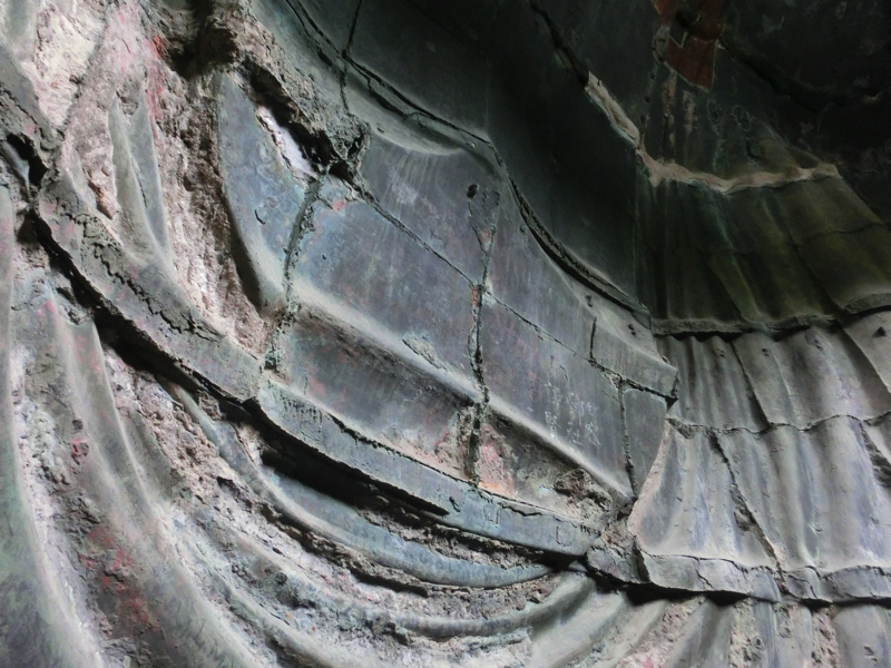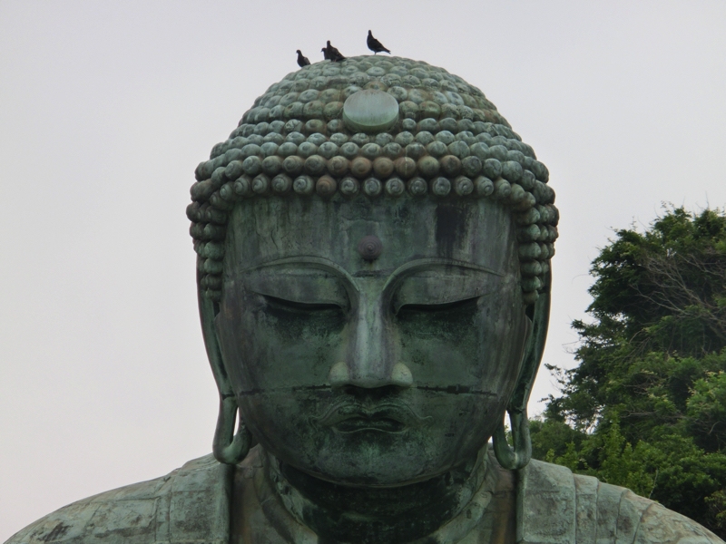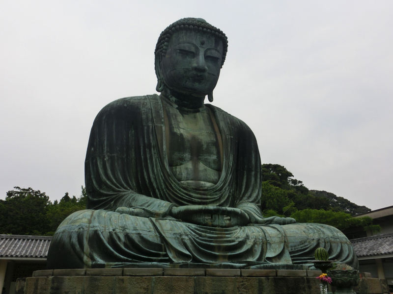 長谷寺をあとにし、続いては高徳院の鎌倉大仏へ。昨日は青空をバックの大仏を楽しんだが、今日は時間が早いので胎内拝観ができる。狭い階段を通って胎内に入ると、ちょっと蒸し暑い。見上げると袈裟の部分が波打っていたり、螺髪の部分が中からも見えたり、首のあたりの継ぎ目が見えたりとなんとも不思議な景色を楽しみました。境内の回廊には、巨大な藁草履が展示されていました。足のサイズはこのくらいなんだろうね。二日続けての大仏拝観、異なる視点で見ることができてよかったです。