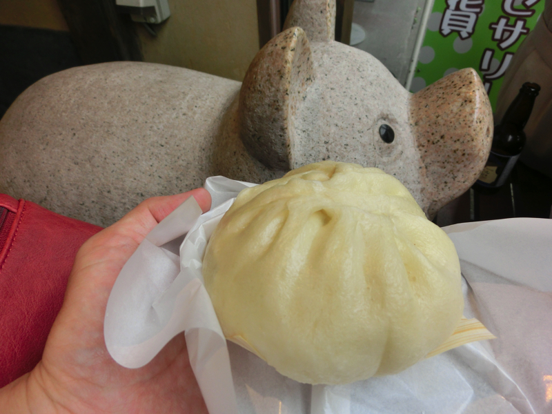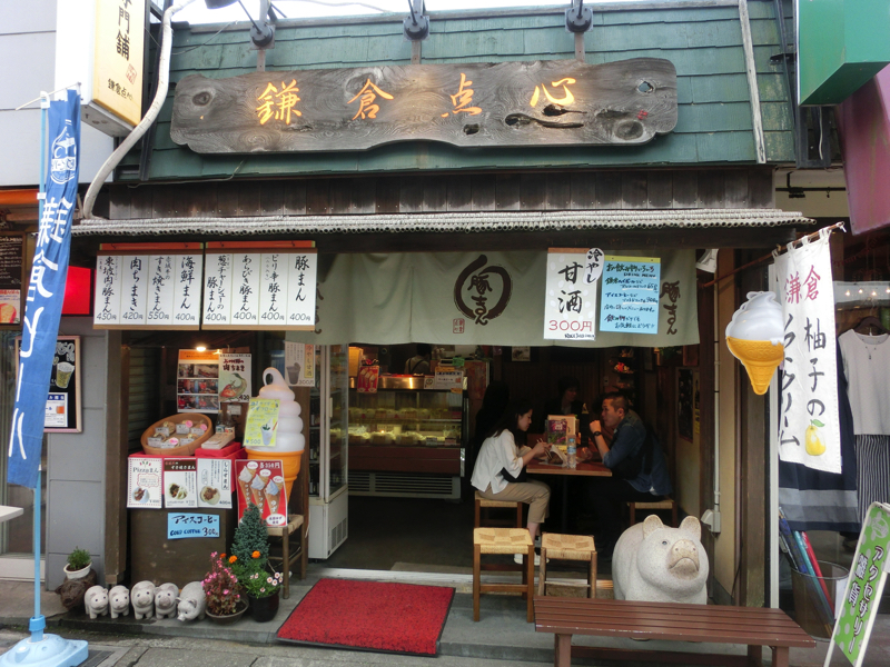 では行きますか。あとは鎌倉駅まで、ざっと20分ほど。鎌倉駅西口に到着し、地下道通って東口へ。ここから小町通へと入るのだが、昨日よりも時間が早いせいかさらに人が多い。ずっと賑やかな通りを行き、通りがほぼ終わるあたりにある豚まんじゅう専門店の「鎌倉点心」に入る。いくつか種類があるが、あらびき肉まんがおいしそうなのでいただきましょう。
