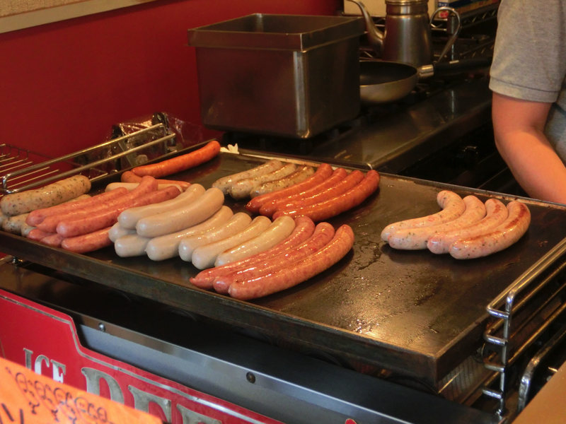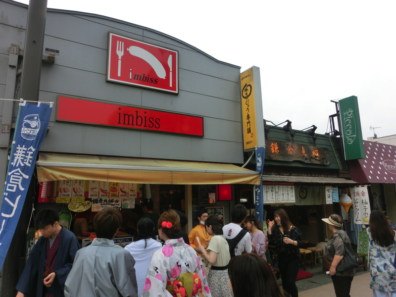 続いては隣のimbiss鎌倉。たくさんのソーセージが鉄板で焼かれていて、どれもおいしそうだ。3種類のセットがあったのでいただきましょう。プレーンとハーブ、あとはカラブレッサというスモーク。どれもパリッとしていてジューシーで、それぞれ異なる風味が楽しめておいしいです。ちょっと遅めの昼ごはん、ごちそうさまでした。