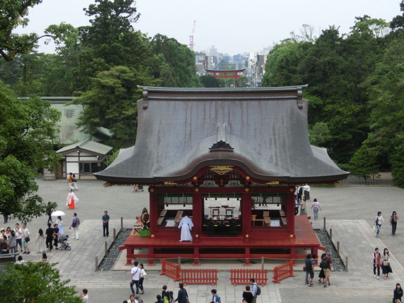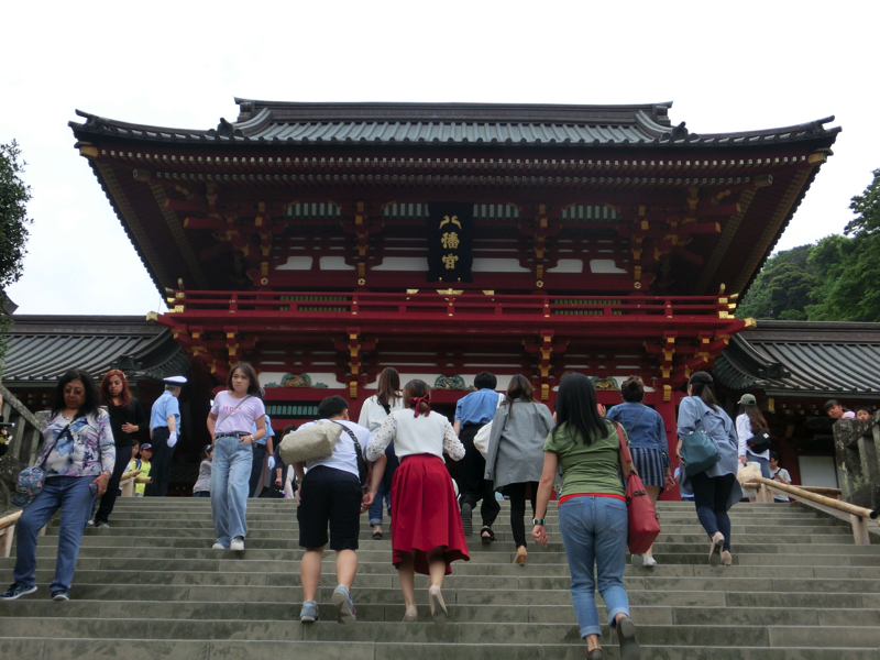 さあ、では最後の目的地、鶴岡八幡宮へ行こう。昔に来た記憶がかすかにはあるが、ほぼ覚えていない。もともとは由比ヶ浜に源氏の氏神として祭祀されたのが始まりのようだが、この場所に移したのは源頼朝とのことで、鎌倉幕府にとっては非常に大事な場所ということ。太鼓橋の向こうに見る本宮を目指して参道を歩いていく。ここは広いなあ。本宮に向かう長い階段の左手には大銀杏があるが、大きな幹しか残っていない。これは2010年に強風によって倒壊してしまったらしく、今はその根から若木が生えてきているとのこと。いつの日か復活するといいな。いよいよ大階段を登る。頑張って登り切り、振り返るとまっすぐ伸びる若宮大路と鎌倉の街並みが見渡せる。