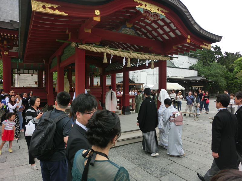 しっかりとお参りしました。本宮から舞殿が見下ろせるが、何やら準備をしている様子。しばらくすると通行に規制がかかり、新郎新婦が入場ということで結婚式が始まりました。たまたまだが、こういう場所での結婚式は多くの人の祝福も受けられるのでいいですね。舞殿への入場を見送り、規制も終わったので行きますか。