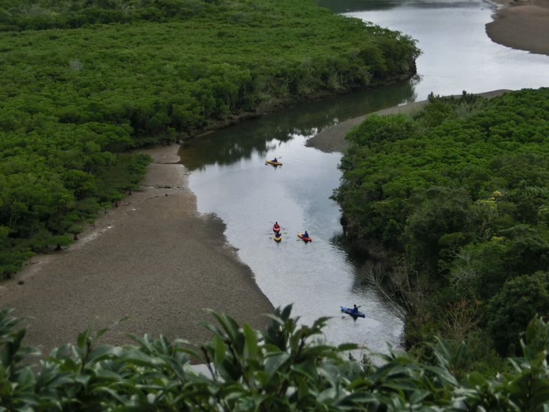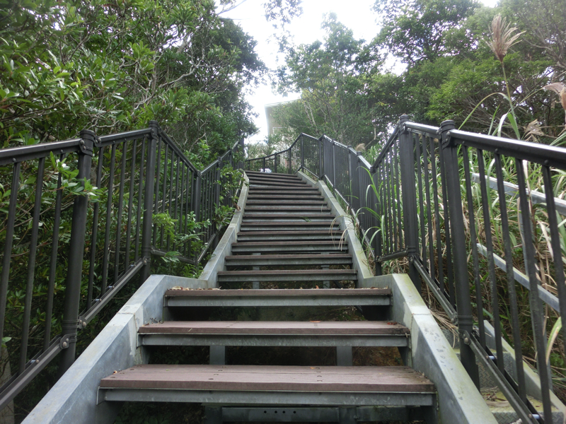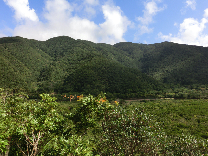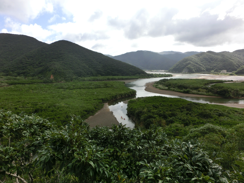さあ、では出発だ。今日の目的地は、まず「黒潮の森 マングローブパーク」へ。市街地や山道などを通っていくが、ナビ通りだし道もわかりやすく走りやすい。長いトンネルを抜け、海が見えたと思ったら目的地のマングローブパークに到着しました。お土産屋さんやマングローブ関連の展示などを見たあと、マンローブパークを散策だ。園内は70万m2もあるらしいが、マングローブを見るためには展望台へと登っていかないと。一気に登るのは厳しいくらいの階段を上がり、展望台に到着。ここからは一面のマングローブと、住用川でカヌーを楽しむ人たちの姿がよく見える。静かな中、カヌーの漕ぎ方を指導する声が聞こえ、なんとものどかなひとときだ。
