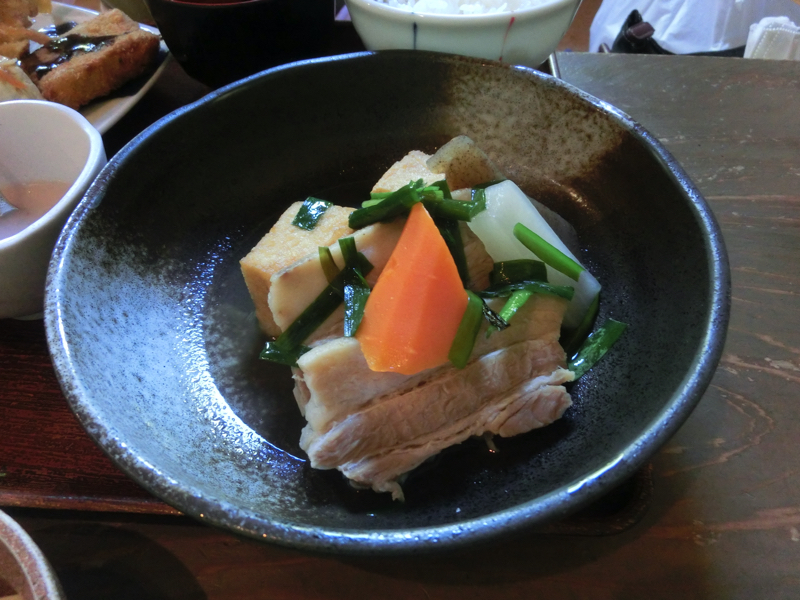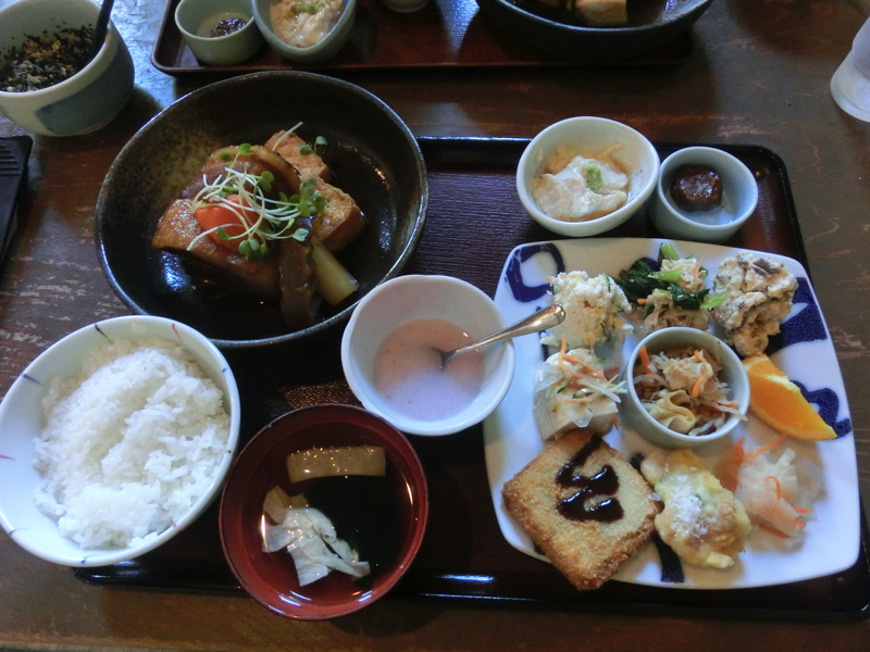 そろそろお昼どき。今日の目当てはもう一つ、島豆腐屋さん。小一時間くらい走ったところにありました。少しだけ待ったがすぐに入ることができてよかった。ここは島豆腐や豆乳の食べ放題があり、あとは選べる定食など。まずは豆乳、自然の豆の甘みが感じられておいしいぞ。島豆腐はしっかりした食べごたえの豆腐だ。あとはミキという、ヨーグルトのような甘酸っぱい発酵飲料。爽やかでおいしいです。しばらくすると定食が登場。トレイにいっぱいにいろんなおかずが並んでいる。おぼろ豆腐やおから、豆腐のフライなどとにかく豆腐づくし。メインとなるのが角煮か塩豚、そこにも厚揚げが入っている。どれもおいしいが、これを全部いただくとなかなかの満腹状態。これ、マグロ丼食べてたらどうなっていたんだろうか・・島豆腐を満喫、ごちそうさまでした。