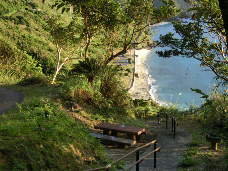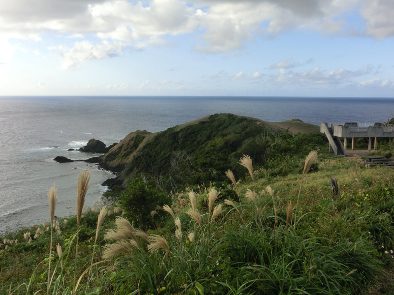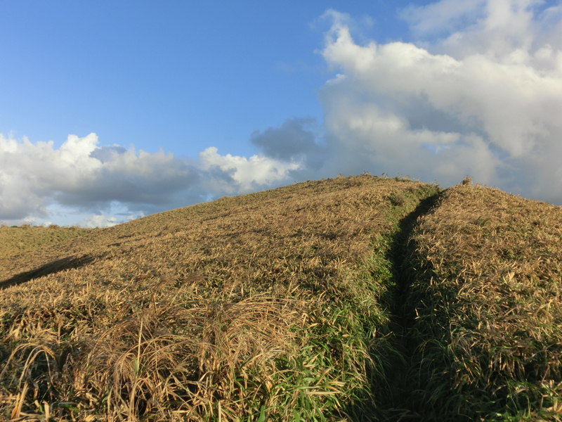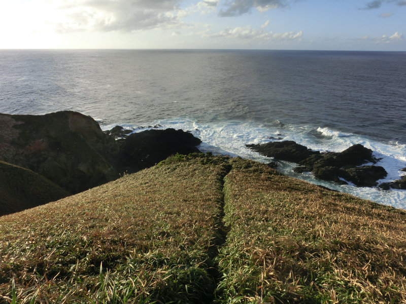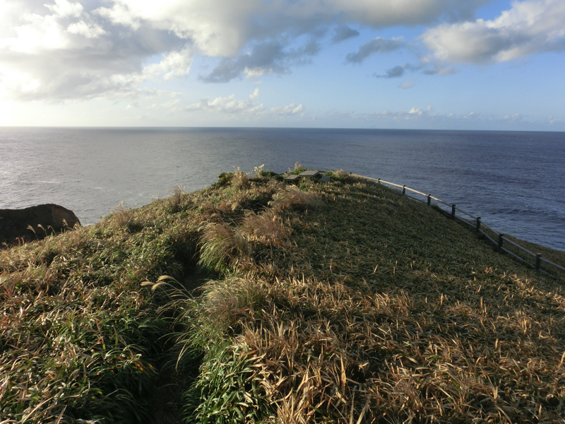 岬が見えることろまでやってきたぞ。ここからはリュウキュウチクという背の低い竹で覆われている。いまは季節的に枯れた感じだが、初夏くらいにくるときれいなんだろうね。海に近づけるところまで行ってみよう。途中に分かれ道があり、岩場の方に降りていく道もあるがそこまではいいかな。岬から見る海は力強く、そろそろ夕方なので光の道もできていてきれいだ。ここはそう、西郷どんのオープニングにて使われた場所。奄美大島はゆかりの場所が多いな。ここで海風をうけるシーンは確かに絵になります。さあ、戻りますか。