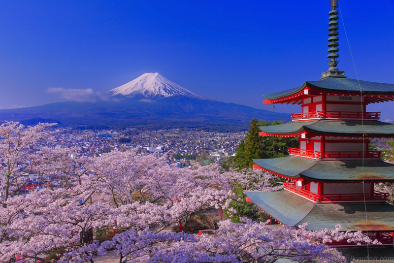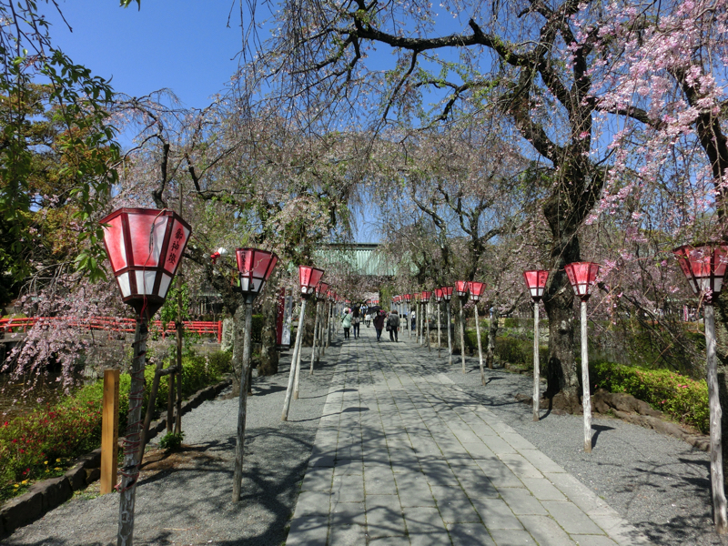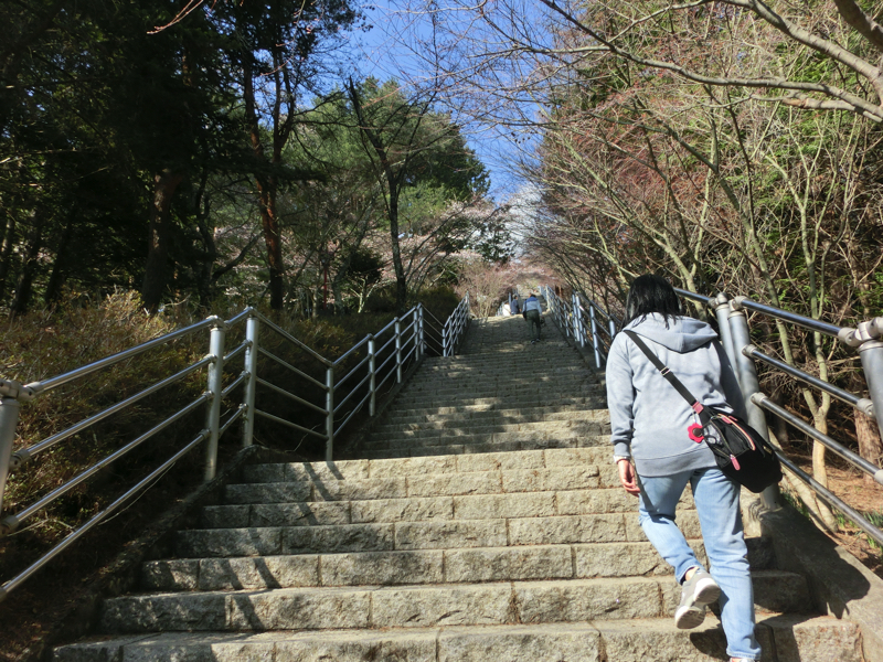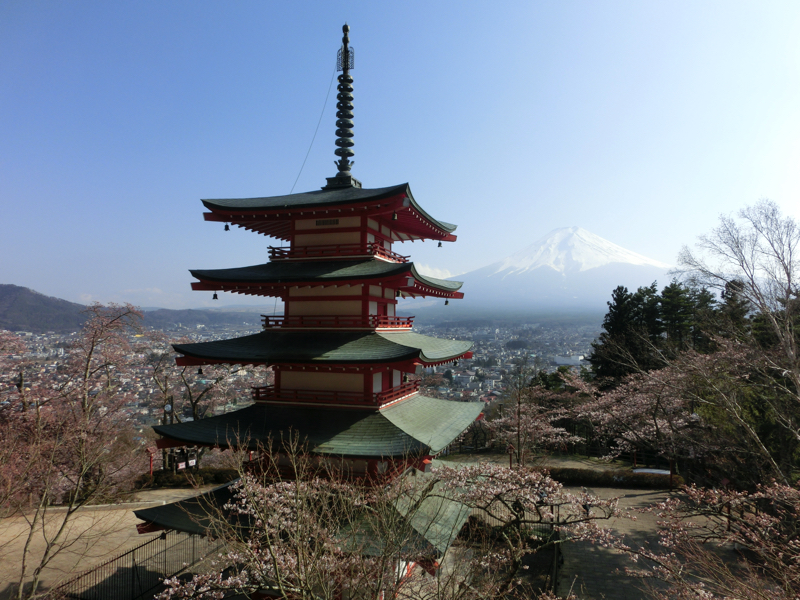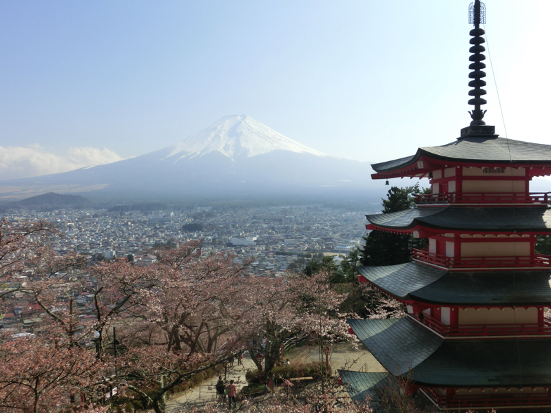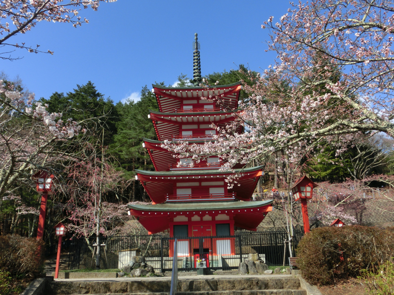 階段を登りきると、そこには五重塔が。桜は七分咲きくらいだが、青空と桜と五重塔、とてもきれいだ。その上にあるのが展望台。ここからは富士山と桜と五重塔というまさにニッポンという景色が見られる。先週雪が降るほどの寒さだったこともあって満開にはちょっと早いのと、晴れてはいるが少し霞んでいるのでイメージ通りではないが、それでもとてもいい感じの景色。今日は金曜なのでそこまで人は多くないが、この週末は混み合うだろうな。