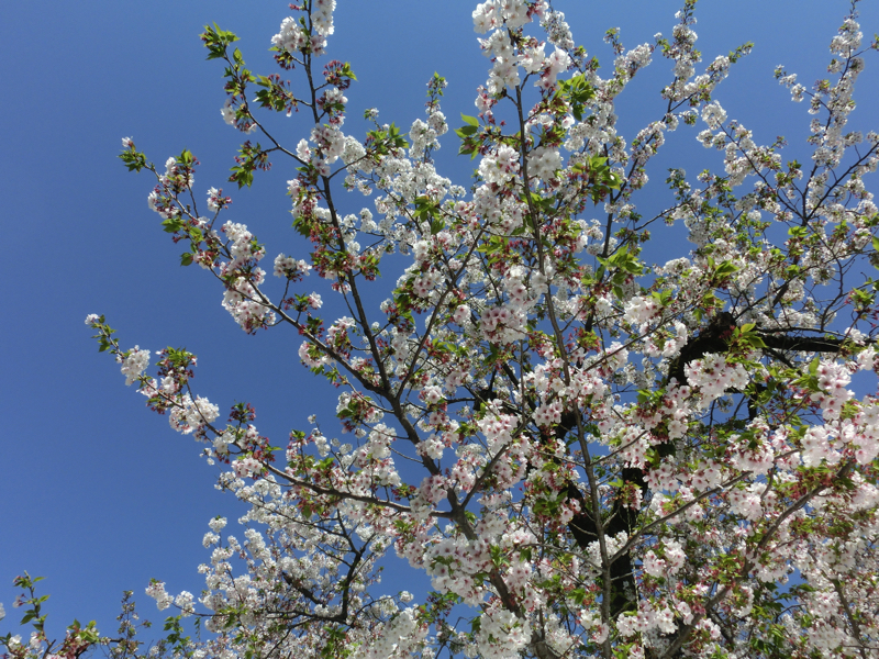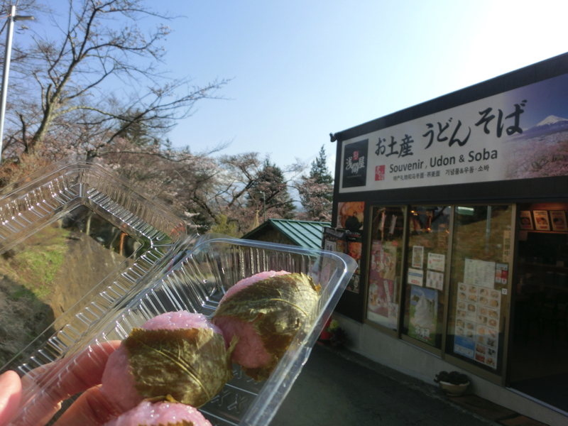 今年はこの数日後、4/12の火曜日がベストだったようです。 で、その後は天気が今ひとつだったとのこと。桜満開と青空のタイミングが都合よく揃うのは難しいですね。さて、景色を楽しんだあとは神社にお参りして、そしてお土産屋さんで桜餅。なんと売り切れギリギリ最後の1パックでした。草餅はたくさんあったけど、やっぱり今日は桜餅がよかったからね。このほんのり塩味を感じる甘さ、おいしいですねえ。