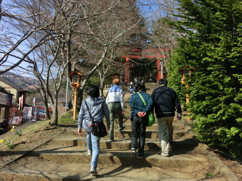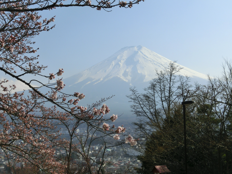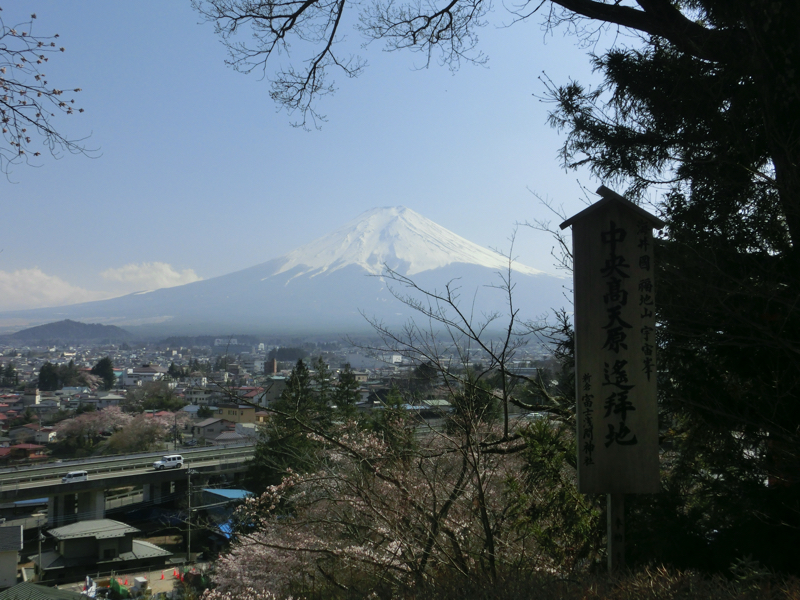 三島をでてしばらくは、間近に富士山が見えるドライブ。こんなに近くで見たことはあったかなあ。その後新東名を少し走るが、このあたりからは雲がかかって見える。山中湖を過ぎ、河口湖の手前に目的地の新倉山はあるが、この時期は近くの小学校の校庭が臨時駐車場になっている。そこからシャトルバスに乗って最寄りの駐車場まで行き、あとは歩き。新倉富士浅間神社を含む新倉山浅間公園に到着し、階段を登っていこう。途中でも富士山をしっかりと見ることができる。このあたりの桜はちょっとまだ早いかなあ。