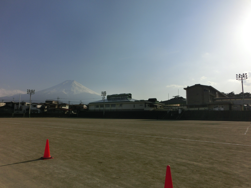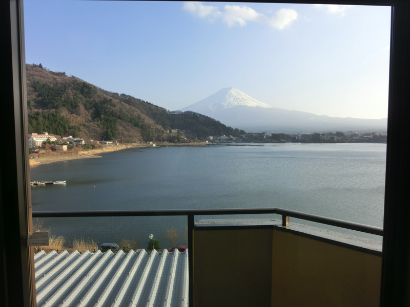 シャトルバスにのり、駐車場へ。それにしてもこの小学校は校庭から富士山の絶景が見える。ここの小学生はこれが当たり前の景色として育っていくんだね。なんだか、いいなあ。ではホテルへと向かいましょう。ここからは10分もかからず到着。今日のホテルは「湖楽おんやど富士吟景」、富士山と湖が見えいるホテルとして選びました。部屋に入ると、まさに思った通りの景色。部屋からこの景色が見えるのはすばらしい。一息ついて、とにかくまずは温泉。屋上にある露天風呂からも富士山がしっかり見えて、これはまさに絶景。