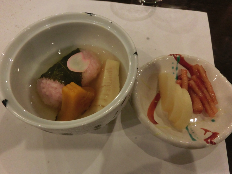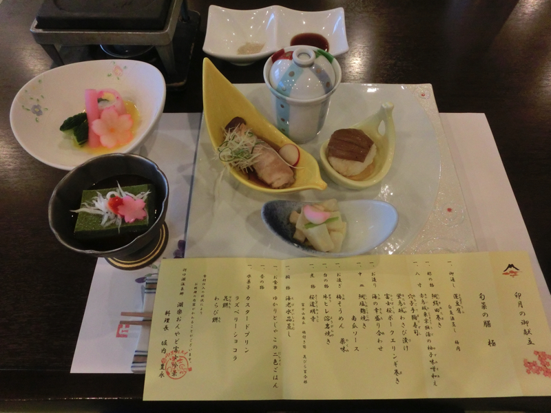 ・煮 物 桜道明寺 ・椀 物 ゆかりとじゃこの二色ごはん ・香の物 ・水菓子 カスタードプリン/ラズベリーショコラ/花餅/わらび餅
