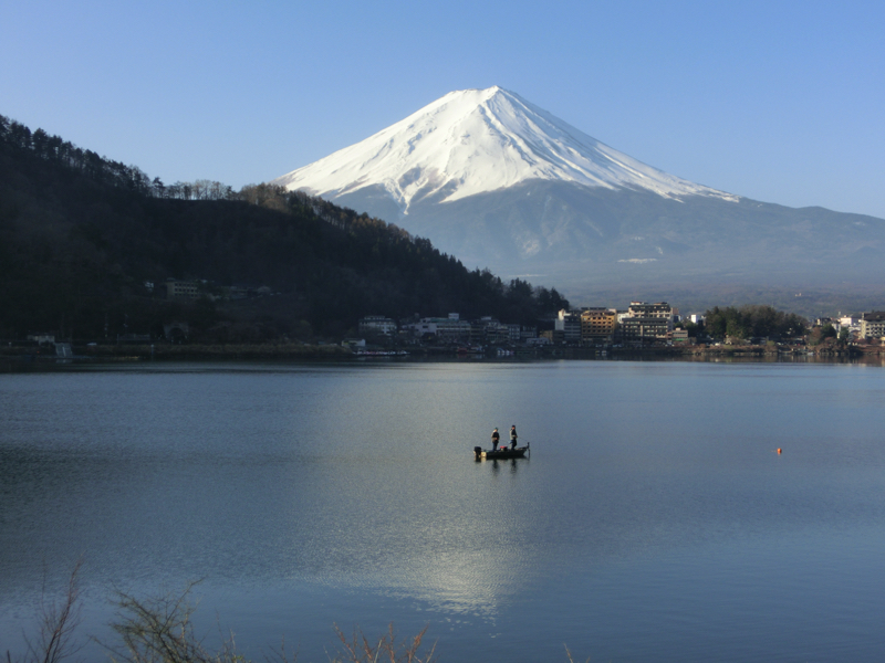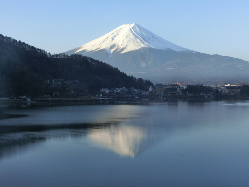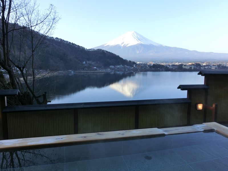 目が覚めるとカーテン越しの朝日が明るく感じられる。いい天気を期待してカーテンを開けると、目の前には朝日に輝く富士山が広がっていた。青空に湖とのコントラストが美しく、湖面には逆さ富士が写っている。これはまさに日本の絶景。朝の露天風呂へと行くと、そこからも逆さ富士を見ることができる。穏やかで、とても爽やかな一日の始まりだ。今日もいろんないい景色を楽しめればいいな。