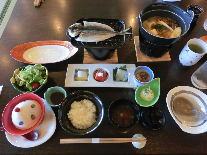 さて、朝ごはんへ行こう。お食事処からもきれいな富士山が見えている。昨日の夜と同じ場所でいただきます。「ほうとう」があるのが山梨らしい。ほうとうはどこかで食べようかとも思っていたが、とりあえずここでいただければ気は済んだかな。イカの刺身や鯵に開き、明太子など、ごはんの進むものがたっぷりだ。おかわりをいただきながら、しっかり栄養補給。ごちそうさまでした。