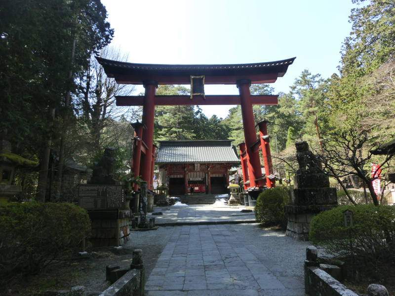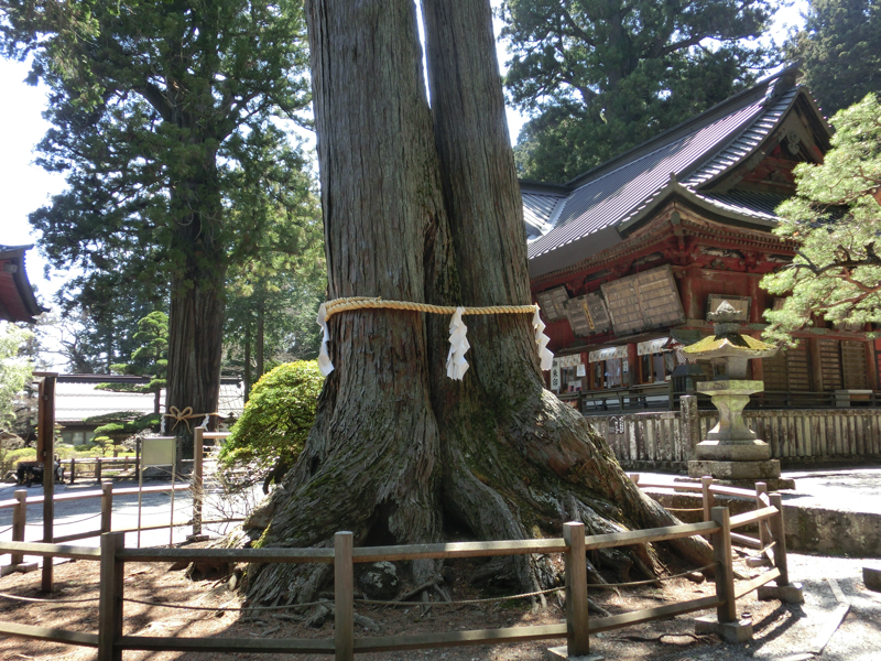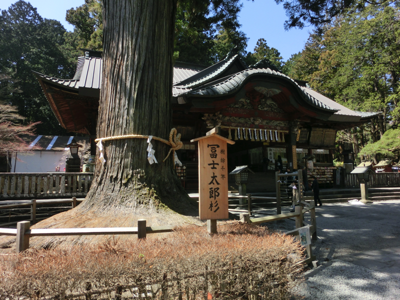 では富士山の周りを巡っていきましょう。まずは、北口本宮富士浅間神社へ。ここは世界遺産富士山を構成資産する一つで、登山道の起点として栄えたとのこと。参道には大きな杉が立ち並んでいて、そこを抜けると大きな鳥居。まだ雪の残る階段を登り、境内へと入る。ここで目を引くのが、巨大な杉。向かって左側にあるのが富士太郎杉、右側にあるのが夫婦杉。どちらも樹齢1000年と言われており、高さ33メートルもあるらしい。これはまさにパワースポットというのにふさわしい。しっかりと、お参りしましょう。