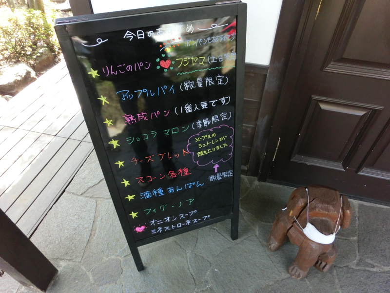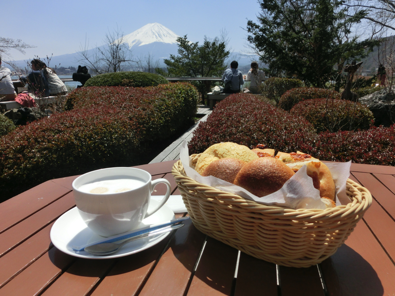 そろそろお昼ごはん。河口湖に戻り、湖沿いを走るとレストランやお土産屋さんが集まっているエリアがある。そこを少し超えたところにあるのが「湖畔のパン工房 レイクベイク」10人くらい並んでいて、順番に案内される。しばらくして中に入るとパンのいい匂いが立ち込めている。いくつかパンを選ぶが、お目当てのりんごのパンが売り切れていたのは残念だが・・桜あんぱんやクリームチーズのパンなど選び、テラス席へ。富士山と湖が見えるところでカフェオレとともにいただく。試食用にとソーセージパンを少し頂きました。このパンが絶品。モチモチ感と小麦の甘み、パリッとした香ばしい皮など、どんどん食べてしまいます。ここでしか食べられないものですね。