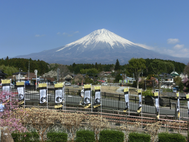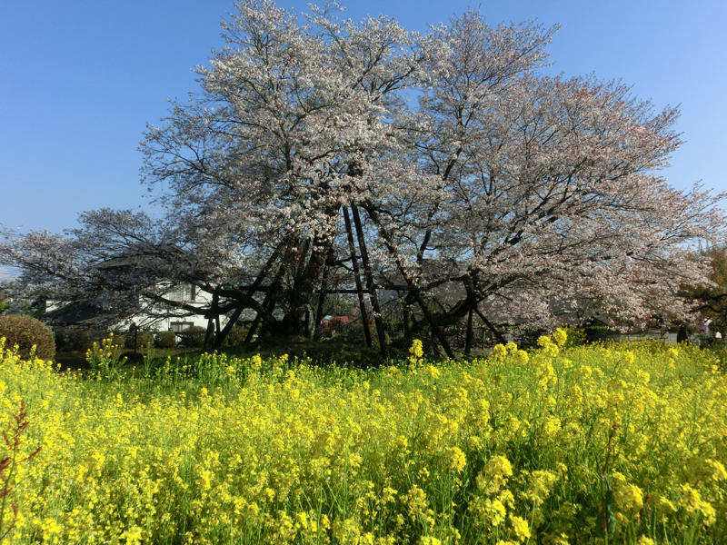 ここから車で数分程度のところにあるのが狩宿の下馬桜。源頼朝が鎌倉幕府の威厳を示すため、富士で巻狩りを行った際にこの桜に馬をつないだとのこと。樹齢800年以上のヤマザクラと言われている。今では、日本五大桜の一つとなっている。菜の花の黄色と富士山、満開を少し過ぎた桜と青空。これもまた絶景だなあ。
