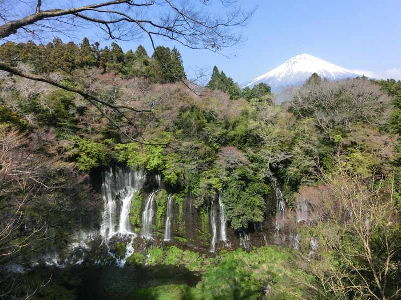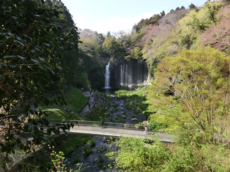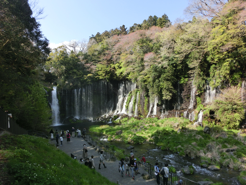 ここでは滝を散策。まずは音止の滝。こちらは水量が多く、轟音を立てて水が落ちている。さらに進むと遊歩道があり、しばらく行くと白糸の滝が見えてきた。幅150mの湾曲した絶壁には細い滝がたくさんあり、これらは富士山の湧水。マイナスイオンに包まれているようだ。滝の近くまで行くと、細かい水滴を感じることができる。少し階段を上がったところに展望台があり、ここから見下ろすと虹とともに滝を見ることができました。