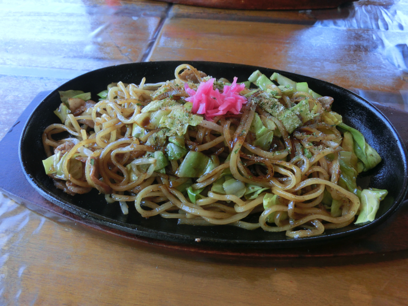 戻りますか。ちょっと小腹が空いてきたので、富士宮やきそばをいただきましょう。もう残り少なかったのか、我々のあとに来た人は断られていました。ぎりぎりセーフだったな。細めでもちもちした麺と魚粉がいい感じでおいしいです。白糸の滝、堪能しました。ここも世界遺産だったね。