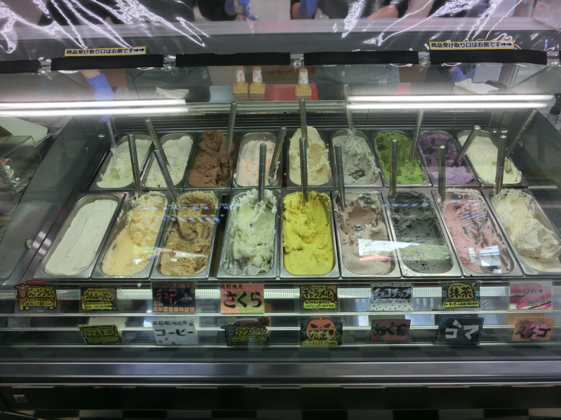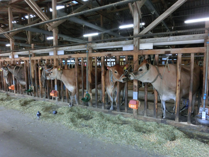 次はスイーツタイム。ということで、近くにある「いでぼくミルクハウス」へ。住宅街のようなところを入っていくと到着しました。ここまで人通りはなかったのに、ジェラートには行列ができていました。種類はいろいろあるが、乳牛によってミルクの味が違うと思うのでジャージー牛とブラウンスイス牛のミルクと、いちごとコーヒーをそれぞれ選ぶ。ミルクも牛によって味が違うのがわかって楽しいです。牛舎にはあとホルスタイン牛の3種がいました。他のジェラートも機会があればまた味わいたいものです。
