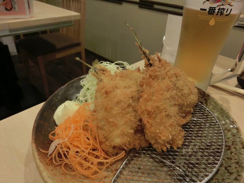 しばらく渋滞でのろのろだったが、その後は快適に走り三島にてレンタカーを無事返却。三島駅へと向かい、在来線で小田原まで。途中、熱海のあたりからはもう暗くなっていました。小田原に到着し、駅直結の「ホテル天成園」へ。最近できたミナカというビルの上がこのホテルになっている。これは便利だな。とりあえずは夜ごはんへ行こう。時節柄21時には閉店になるので、ミナカの中にある「あじ屋でん助」へ。ラストオーダーも近いので、あじタタキとアジフライを頂きましょう。まずはビール、今日一日の疲れをのどごしで癒そう。これに新鮮なあじタタキ、そしてふっくら肉厚のアジフライ。完璧です。ごちそうさまでした。