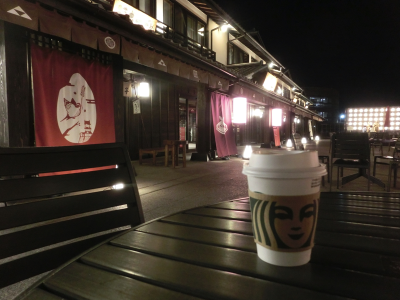 まだ早いので、ちょっとゆっくりしよう。駅のスタバでカフェオレをゲットし、ミナカに戻る。ここの3階が金次郎広場といい、テーブルがあるスペースになっている。少し肌寒いが、外でゆったりするのも気持ちがいい。