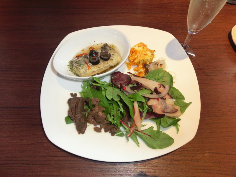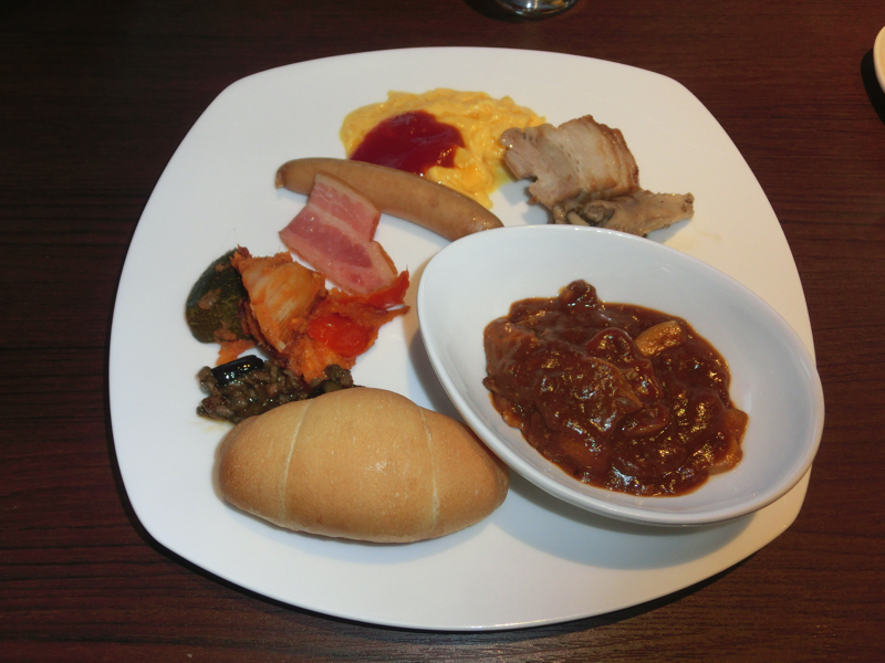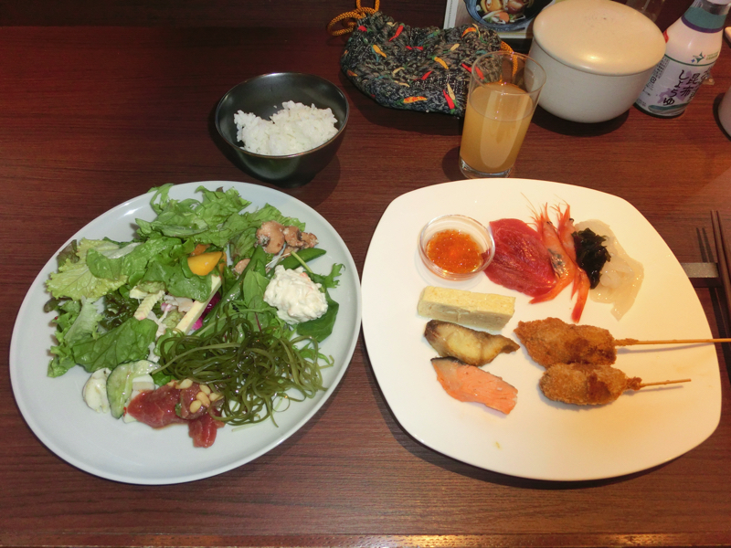 さあて、朝ごはん。函館旅行の一大イベントだ。8時にレストランに行くと、そこにはたくさんの人が。30分以上は待つとのことで、すぐ前のお土産屋さんを見ながら過ごす。結局40分以上待ったところでようやく案内されました。中に入るとなんともたくさんのメニューが並んでいるぞ。さすが函館朝食戦争の一角、いったいどれからいただきましょうか。まずはサラダ類と、お刺身のまぐろ・えび・いか・いくらなどを頂きましょう。あまり取りすぎないようにしないとね。第二の皿は洋風中心でビーフシチューなどもいただき、第三の皿はアクアパッツアにスパークリングワインを合わせてみる。とても朝ごはんのレベルではないな。