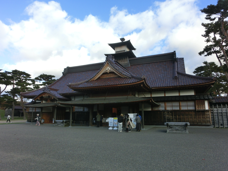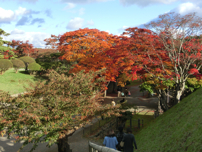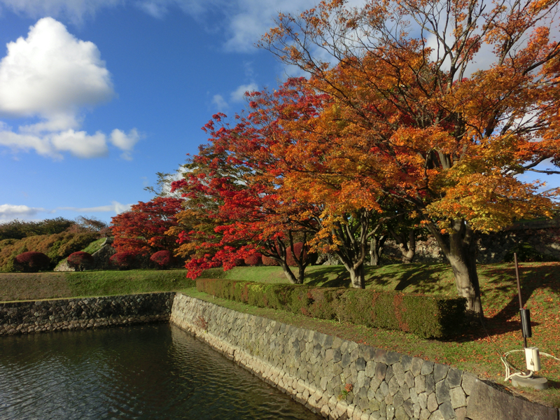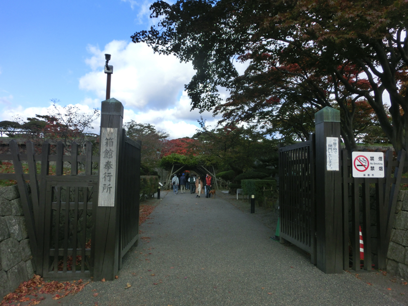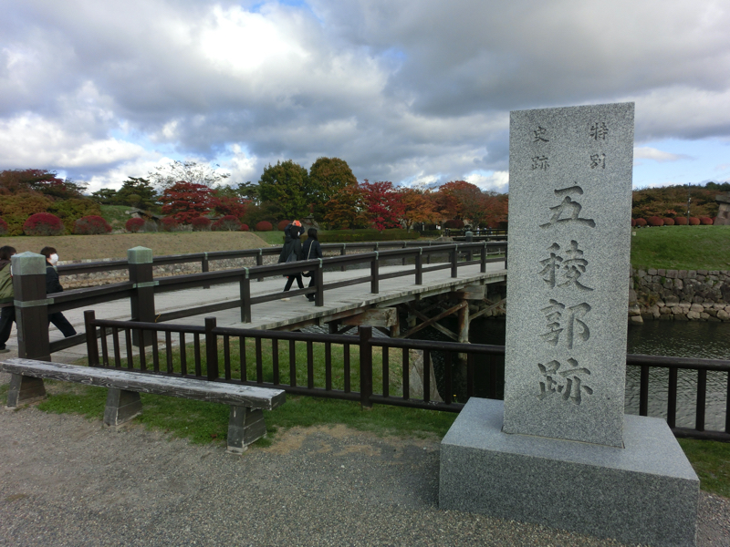 タワーを降りて、五稜郭へ向かう。中を散策しましょう。お堀から見える樹々がきれいに紅葉しているぞ。入り口には「箱館奉行所」の看板がかかっている。中に入りしばらく歩くと、三分の一程度の規模で復元された箱館奉行所が。ここは箱館戦争で旧幕府軍の拠点となったところ。近くには設計者・武田斐三郎の顕彰碑があり、なんでも頭が良くなるようにとことで修学旅行生が触るらしく、頭や顔がピカピカに輝いていました。