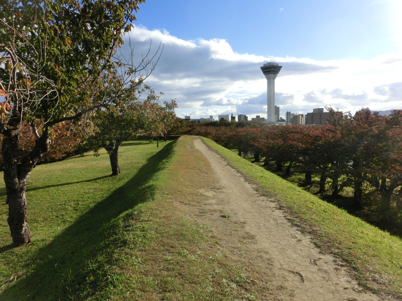 五稜郭の中は広々として気持ちがいい。土手に上がり、歩いてみる。今は紅葉だが春にはここが桜で満開になるので、これはすごいだろうな。そんな景色も見てみたいが、こんなふうにのんびり歩くこともできないよね。入り口近くまで戻ってきた。ちょうど太陽がしっかりと出てきたので、紅葉も更にきれい。いい感じだね。五稜郭タワーに戻り、お土産を見てみる。特に買いたいものはなかったが、五稜郭の四季の写真がきれいだな。