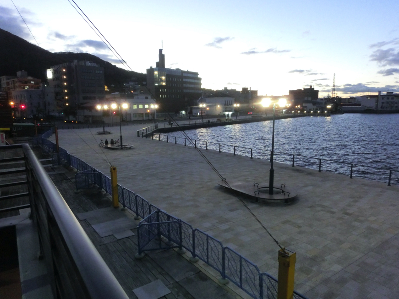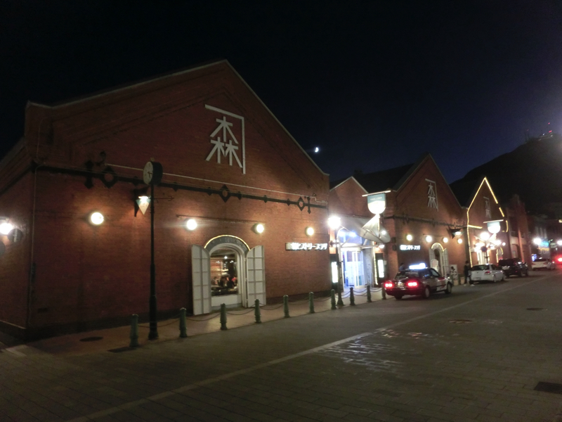 では倉庫を改装したスタバへと行きましょう。ようやくお腹が落ち着いてきたし、今日はゆっくりだがずっと歩いていたわけだ。カフェオレでほっと一息だ。このスタバは函館湾に面しており、二階から見渡すことができる。天井が高くレトロな雰囲気は落ち着きます。暗くなってきた。赤レンガ倉庫街へと行きますか。街灯がいい雰囲気だな。倉庫の中はお土産屋さんやレストランなど、様々なお店がある。お土産をいろいろ見てみるが、とりあえずはトラピストクッキーとバター飴というど定番をゲット。他にも買いたいが、そこまでピンとくるものがないなあ。まあ明日空港でもゆっくり見てみよう。