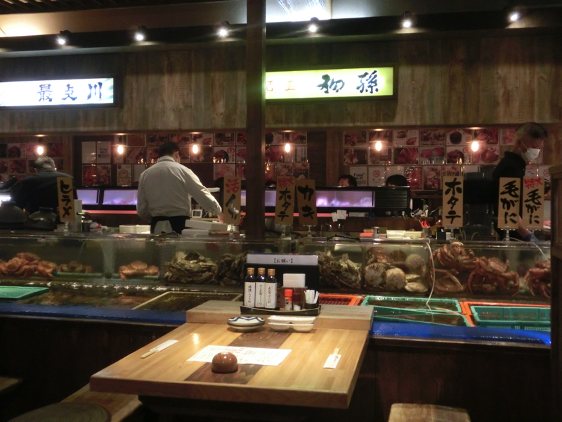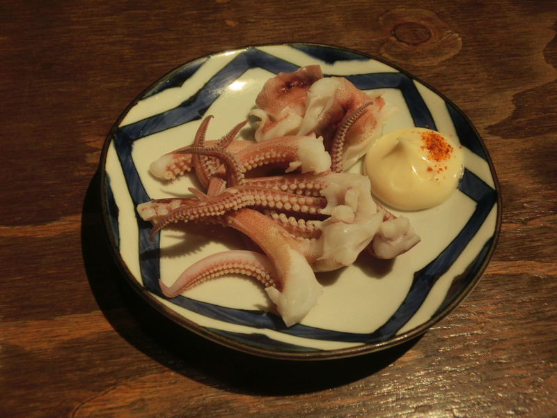 さすがに夜ごはんは食べないと。ホテルに向かう途中にある「海寿」というお店に入ると、満席でかなり待つとのこと。とはいえ急いでないし他に気になるお店もないし、ホテルも近いので席が空いたら連絡もらうことにしてしばしホテルで休憩。30分程で連絡が来ました。思ったより早かったな。では行きますか。お店に入り、まずはビールで喉を潤す。お通しは北海道らしくカニ。いいですね。さあ、ここはやっぱり「活けイカ刺し」でしょう。水槽で泳ぐ活イカの刺し身は超新鮮、しばらくは動いていました。美しい身は甘みと歯ごたえが最高です。肝は新鮮なので臭みなくしっかりした形をしており、イカが濃縮されたような旨味。このゲソ部分は刺し身か茹でにしてくれるとのことなので、茹ででいただきましょう。やっぱり新鮮だとどういう食べ方でもおいしいですね。