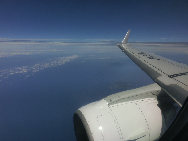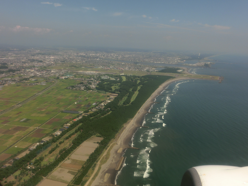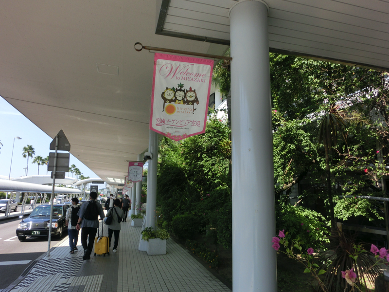大阪は曇り空なので、離陸してしばらくはずっと雲の上。30分くらい立った頃から、島影や海などが見えるようになってきた。飛行機は徐々に高度を落としていき、日向灘の海岸線がきれいに見えている。向こうの方に見えるのはシーガイヤかな。その向こうには延岡、そして高千穂があるのだが、そちらはまた別の機会に。今回は宮崎市近辺をメインに動く感じです。内陸に入って旋回し、海側に向かって高度を落とす。宮崎ブーゲンビリア空港に無事到着だ。荷物を受け取り、空港近くのオフィスでレンタカーを借りる。