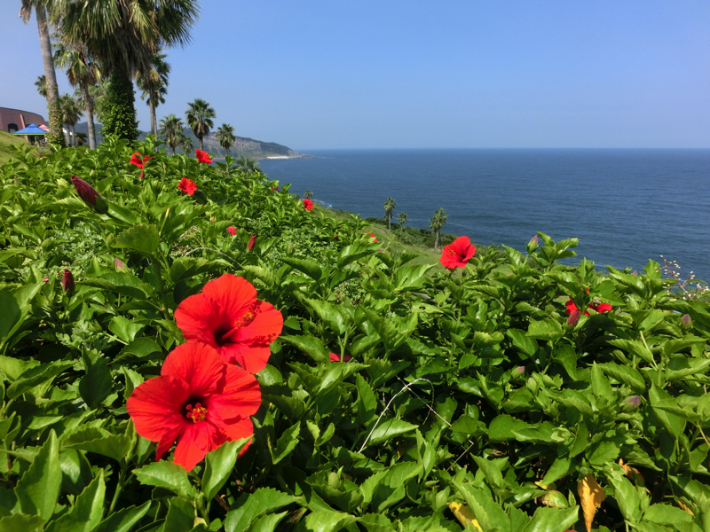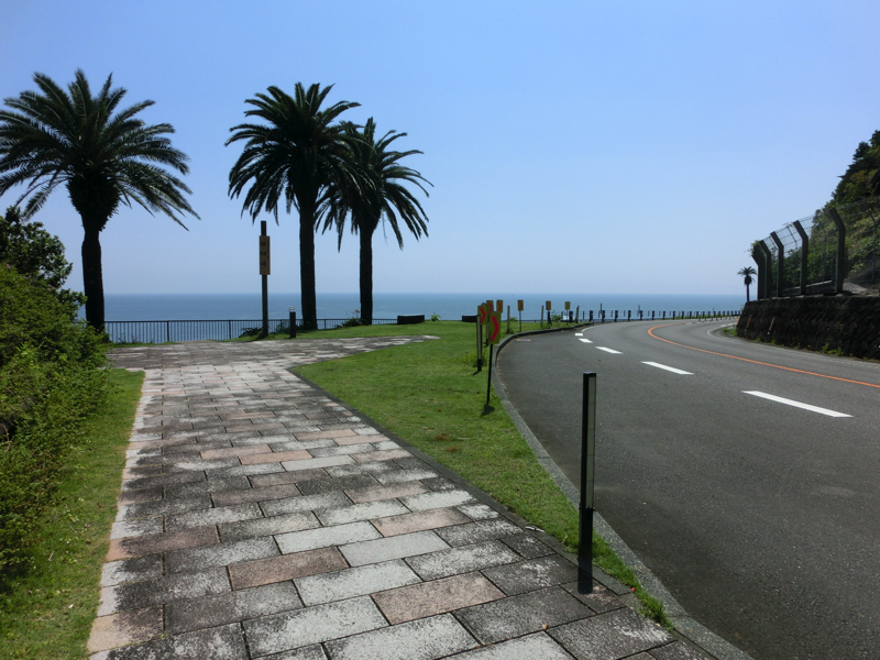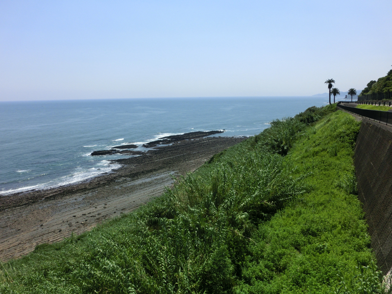 さあ出発だ。海岸沿いを目指して走っていこう。空港を出てすぐに大通りを走るが、道の中央分離帯に背の高いヤシの木が等間隔で植えられている。いかにも宮崎といった景色です。すぐに青島神社への案内が出てきたが、それは明日。今日はできるだけ南方面へ行ってみよう。しばらく走ると海が見えてきて、到着したのが「堀切峠」。ここは日向灘と波状岩が織りなす独特の景色。この岩は「鬼の洗濯岩」と呼ばれていて、砂岩と泥岩が積み重なった地層が隆起しそれが波に侵食されて今の姿になったとのこと。今はちょうど干潮の時間帯なので、多数の岩をしっかりと見ることができる。ここから少し行くと「道の駅フェニックス」。ここからもまた違った景色を見ることができる。道の駅なのでお土産の下見をして、行きますか。