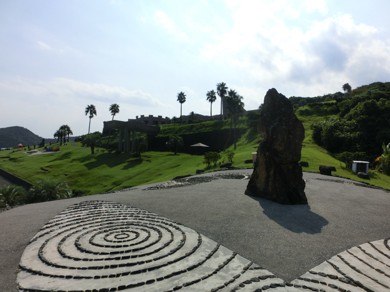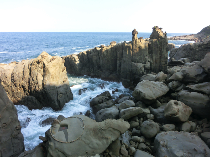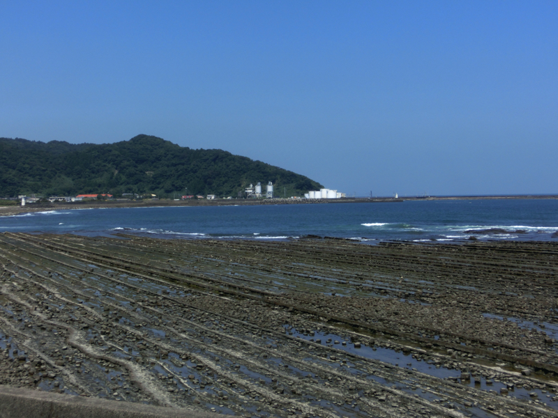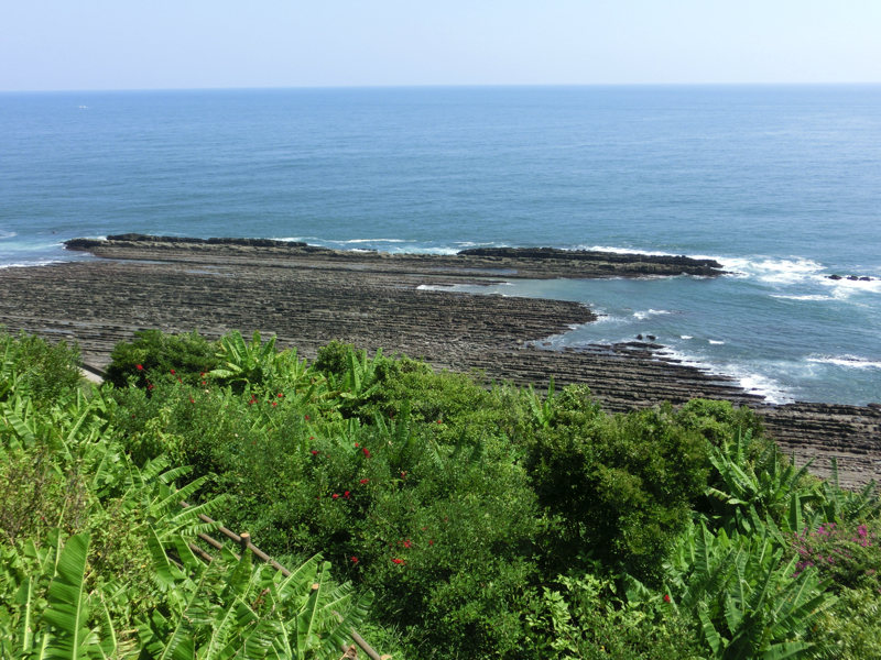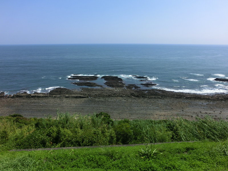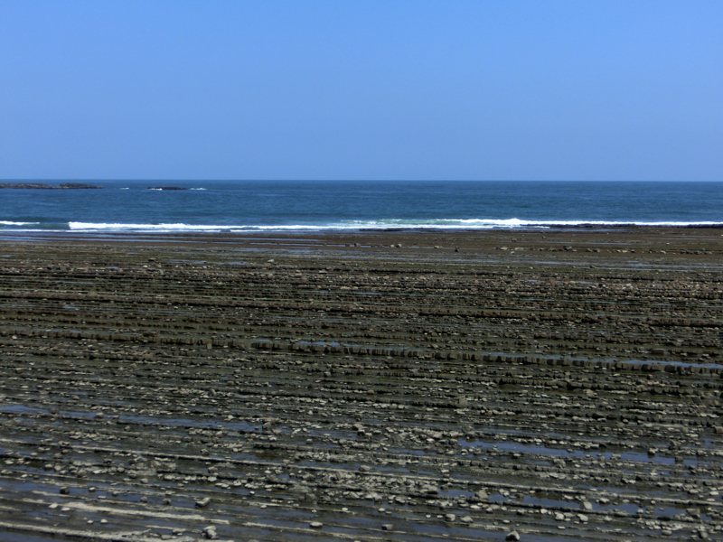 南風茶屋を出て、しばらく走ると「デモン・デ・マルシェ」というパーキンエリアに到着。あまり人がいないのでちょっと寂しい感じだが、駐車場から見る海岸が一面の奇岩。まさに「鬼の洗濯岩」という風情だ。ここはこういう岩がよく見える場所のひとつなんだろうな。