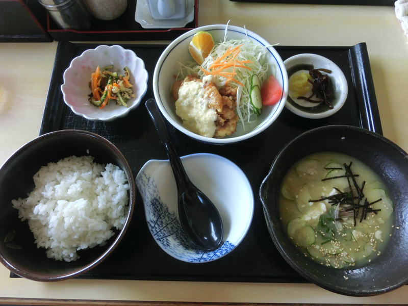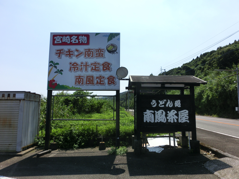 しばらく走り、道沿いにある「南風茶屋」に到着。ここでお昼ごはんを頂きましょう。宮崎最初のごはんは、冷や汁定食をいただきます。チキン南蛮もついているのが宮崎初心者には嬉しいところ。チキン南蛮は柔らかい鶏肉にタルタルソース、甘みと酸味の効いたタレ。ごはんにあう。そして冷や汁、枕崎産のなまぶし、いりこ、胡麻、味噌をあわせ直火焼きしたものにだし汁を合わせ、豆腐、胡瓜、胡麻、紫蘇、海苔などを混ぜていただく。そのままでも冷たくておいしいし、ごはんにかけてもサラサラ行ける。夏は冷や汁が実にうまい。