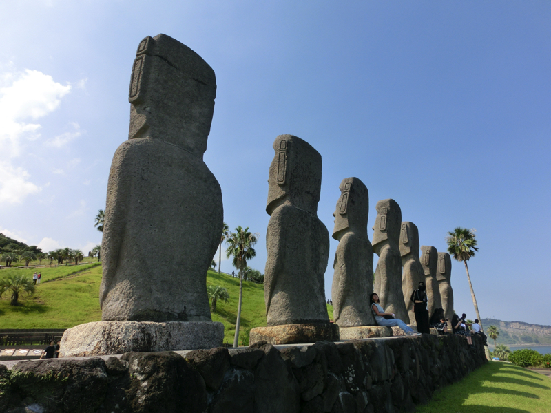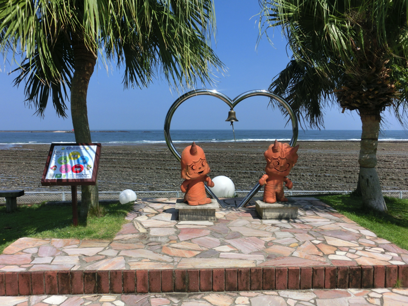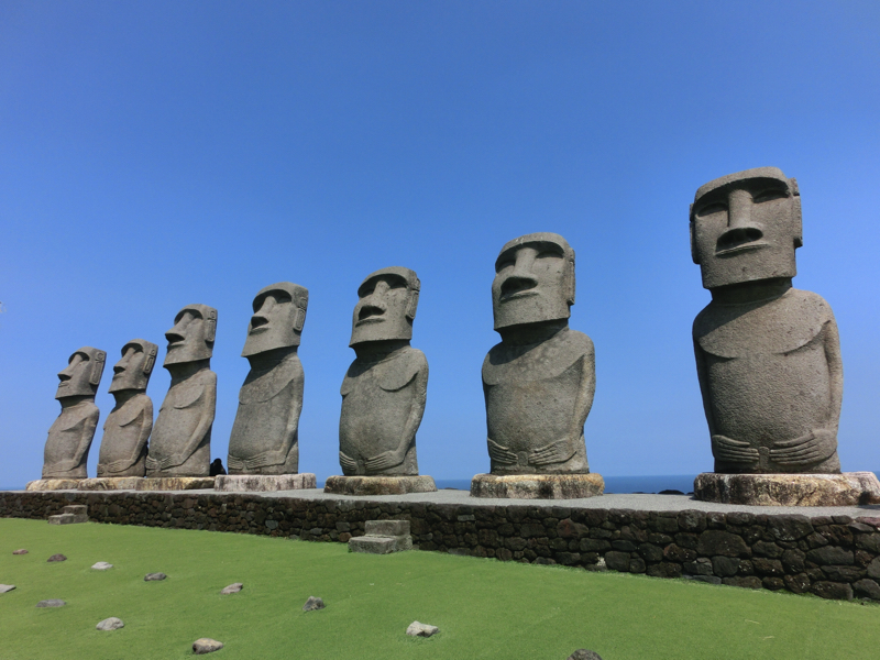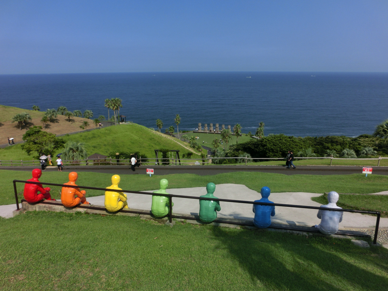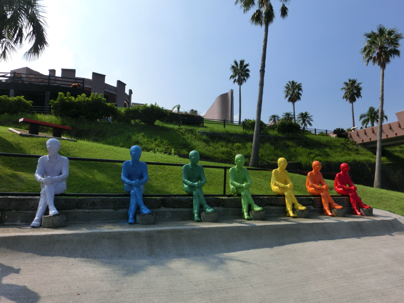 どんどん行こう。続いて到着したのは「サンメッセ日南」。ここはやはり、7体の「モアイ像」。イースター島の倒れていたモアイを日本の修復チームが復旧させたことがきっかけで、現地の長老会に許可を得て日本での復刻が実現したとのこと。約4.5メートルの巨体が青い海をバックに立ち並んでいる様子は壮観だ。たくさんの人がモアイと写真を取ったり直接触れたりしている。モアイのある広場には、代表的な世界遺産の陶板が展示されている。広場から丘を登っていくと、途中にカラフルな人たちの像が。これは「ヴォワイアン像」というもので、ちょうどモアイを見下ろす形になっている。モアイと同じ7体というのはなにか意味がありそうだ。一通り見回ったので、お土産屋さんへ。暑いので水は買っておきましょう。