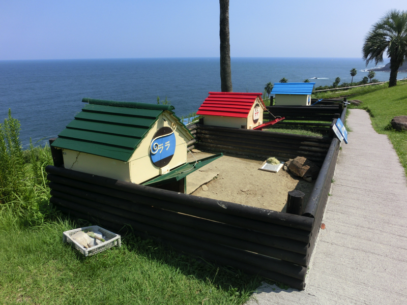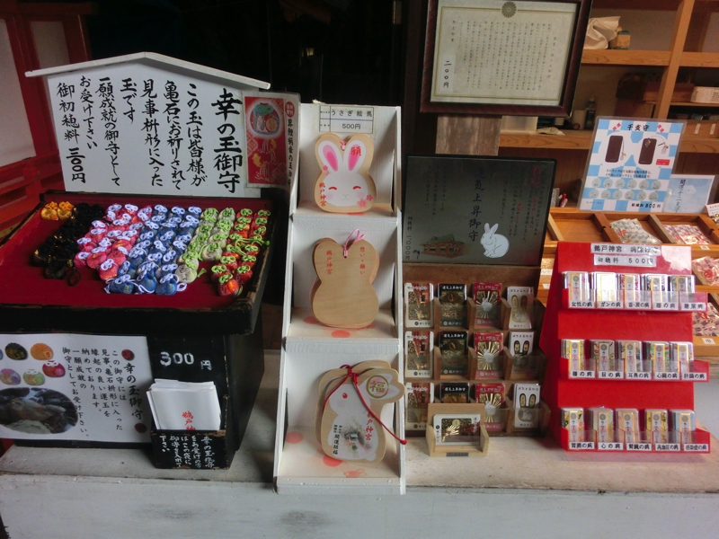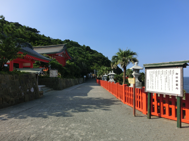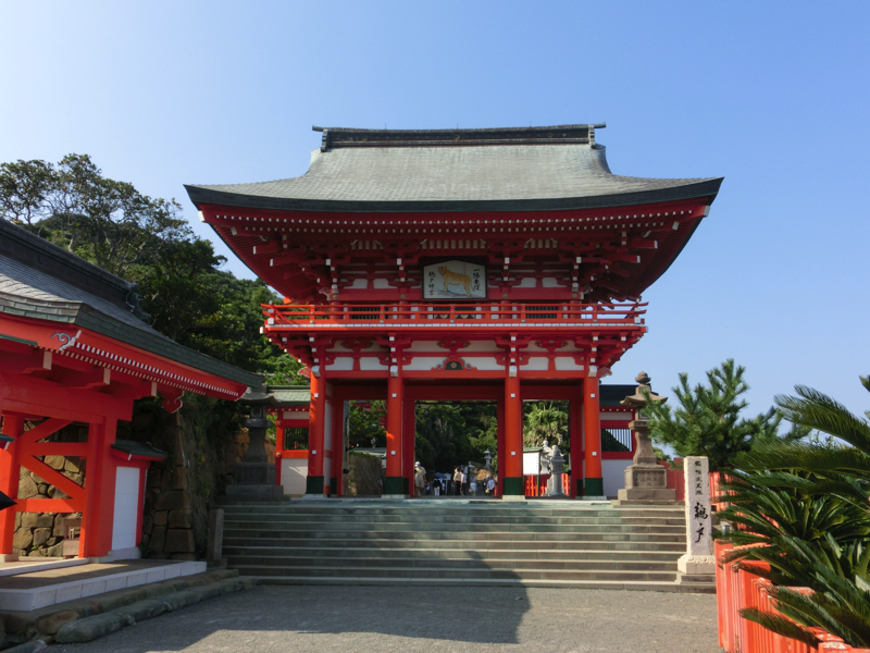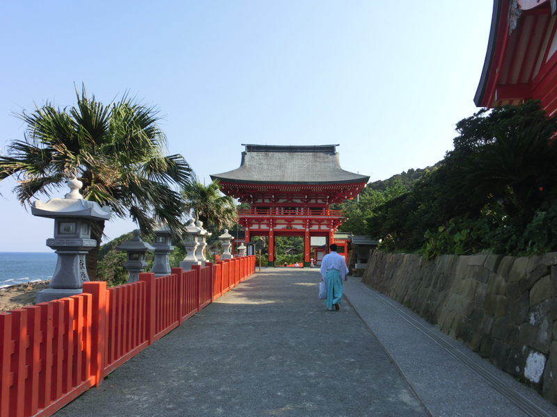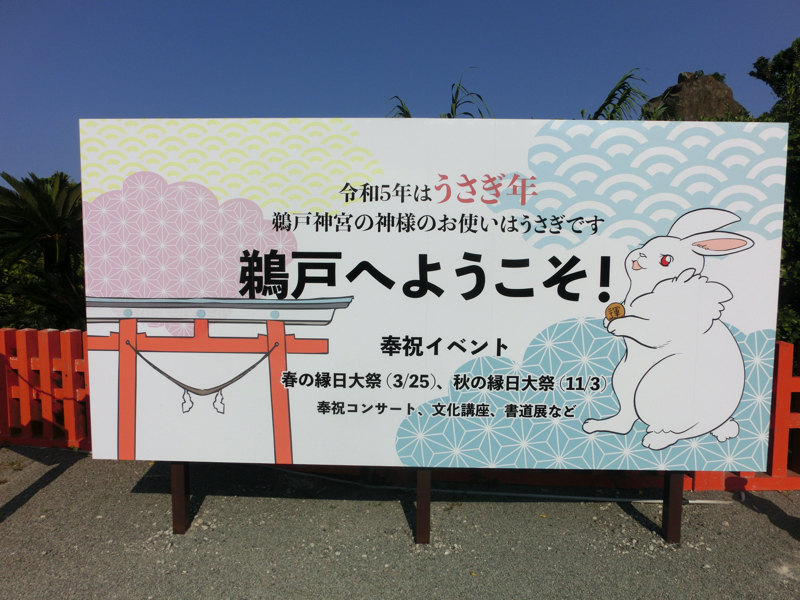 鳥居を越えたところには、来年の干支であるうさぎの案内が。うさぎは鵜戸神宮の神の使いで、鵜と兎、卯の連想もあるようで。神門、楼門とくぐり、海沿いに歩いていく。海が青く、気持ちがいい。朱色の柵の前にところどころうさぎの石像がある。いろんなポーズがあり、それぞれ小銭が置かれているのが面白い。