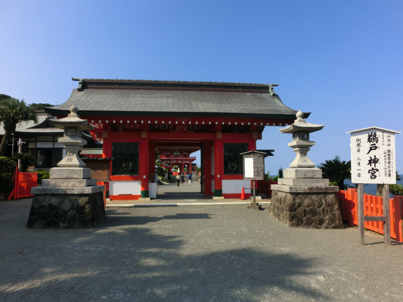 次は「鵜戸神宮」へ。30分ほどで到着したが、バスも止まる大型駐車場でちょっとここからはまだ遠いようだ。とりあえず向かってみるが、トンネル通って階段降りてとまだまだ先がありそうだ。もっと参道らしきものや大鳥居があればと思ったがここは一旦引き返し、もう少し車で先へ進む。すると海沿いの細い道に入ってすぐに鳥居があり、そこを入って進んでいくともう一つの駐車場に到着。ここはすぐに境内に入れそうで、これでいい感じ。