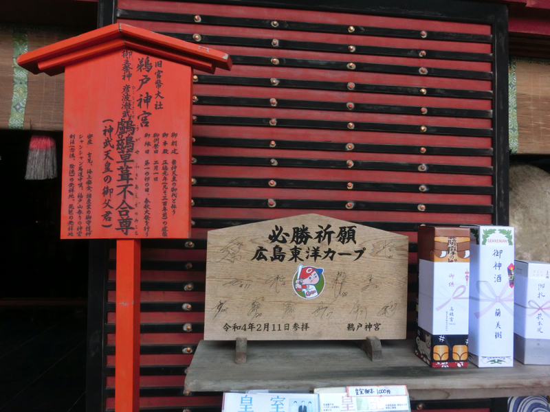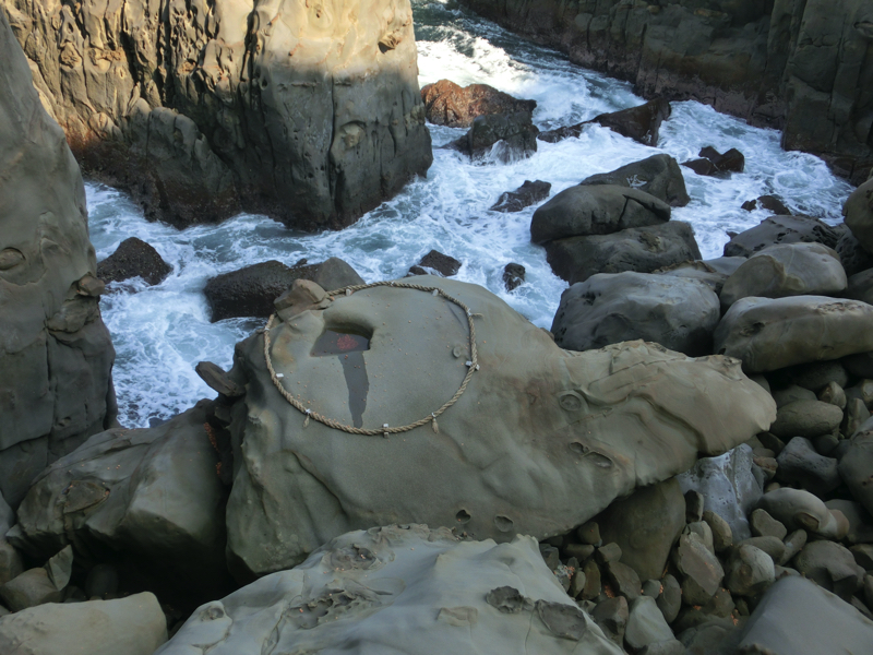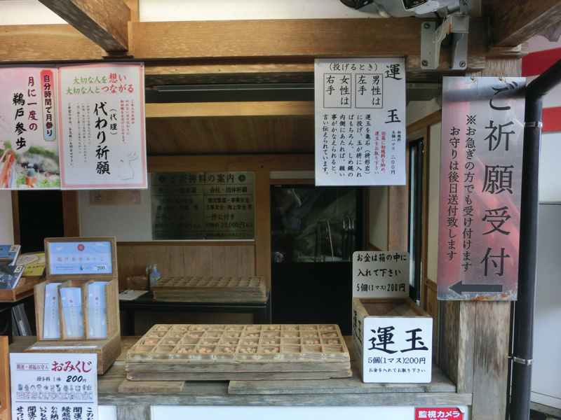 千鳥橋、玉橋と過ぎ、海を見下ろす石段にやってきた。断崖と朱色のコントラストが絶景だ。石段を降りると洞窟があり、その中にあるのが本殿。縁結びや安産祈願のご利益があるそうだが、広島カープの必勝祈願が奉納されている。さて、ここでの祈願は運玉に託す。亀石という岩の上部にあるくぼみに運玉という素焼きの粘土石を投げ入れることができれば願いが叶えられるとのこと。女性は右手、男性は左手でということで、それぞれチャレンジ。運玉は5個ずつあるが、結果左手で投げた一つだけがくぼみに入りました。これで願いが叶えられますね。