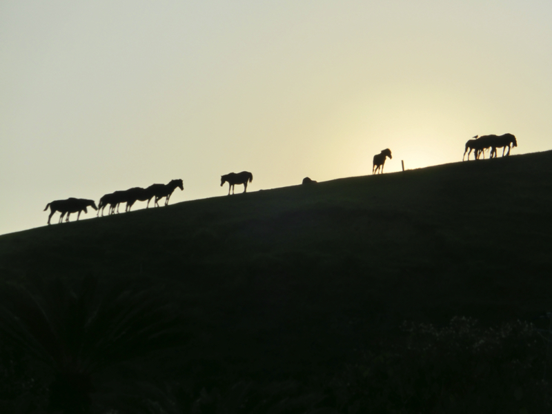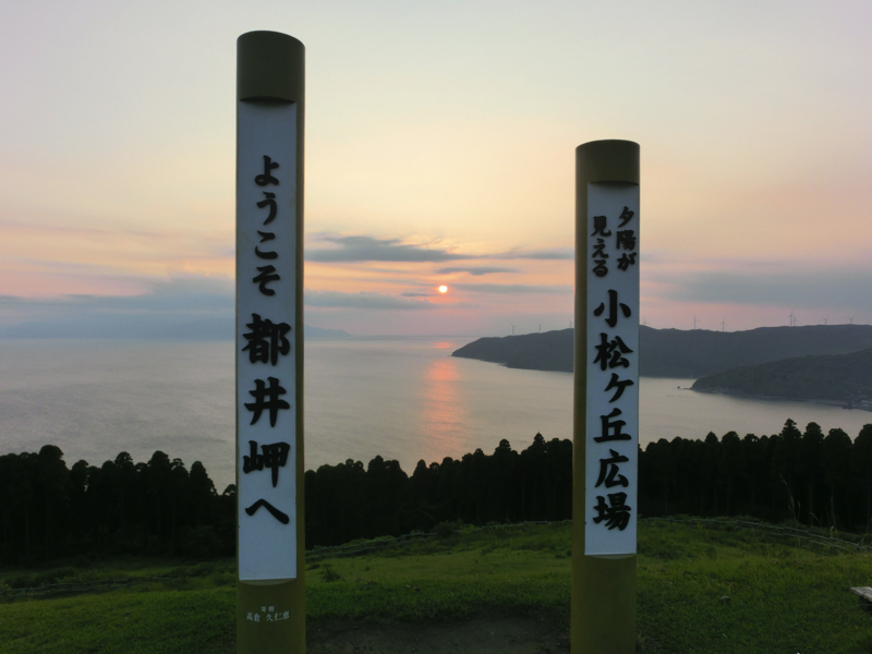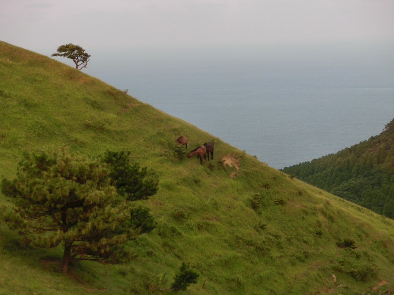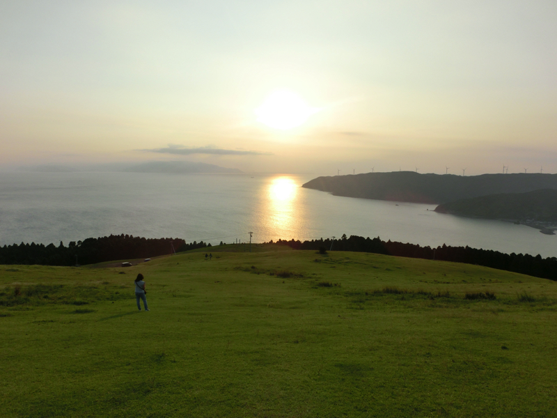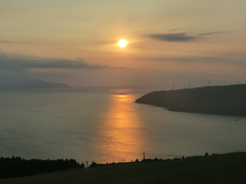 ここからはひたすら南へと向かう。海岸沿いの道や山道などを走り、約1時間半ほどで都井岬へ到着。ここは天然記念物の野生馬「御崎馬」が120頭ほどいるらしい。エリアが広いのでどのあたりにいるのかわからずしばらくウロウロとするとはぐれ馬が道沿いにいたりしたが、小高い丘の牧草地に集まっているようだ。丘の下からはよく見えないので登ってみよう。すると、十数頭の馬が集まっているところが見えた。ある程度までは近づいてみよう。どうやら子馬もいるようで、静かな中で草をはむ音が聞こえている。夕日とともに、いい景色だな。