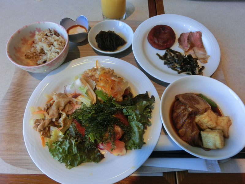 8時過ぎ、朝ごはんへ。ここのバイキングは、沖縄の食材が多数使用されている。昆布イリチーやドゥル天、もずくや豚角煮、ジューシーなど。サラダには海ぶどうをたっぷり載せていただきましょう。やっぱりたくさん食べてしまうなあ。食後には沖縄ぜんざいやマンゴーなどをいただき、ごちそうさまでした。部屋に戻って準備して出発だ。今日はレンタカーを借りるために、県庁前からゆいれーるに乗っておもろまち駅まで。ここに巨大な免税店があり、その中にレンタカーのカウンターがある。巨大な駐車場から出発だ。